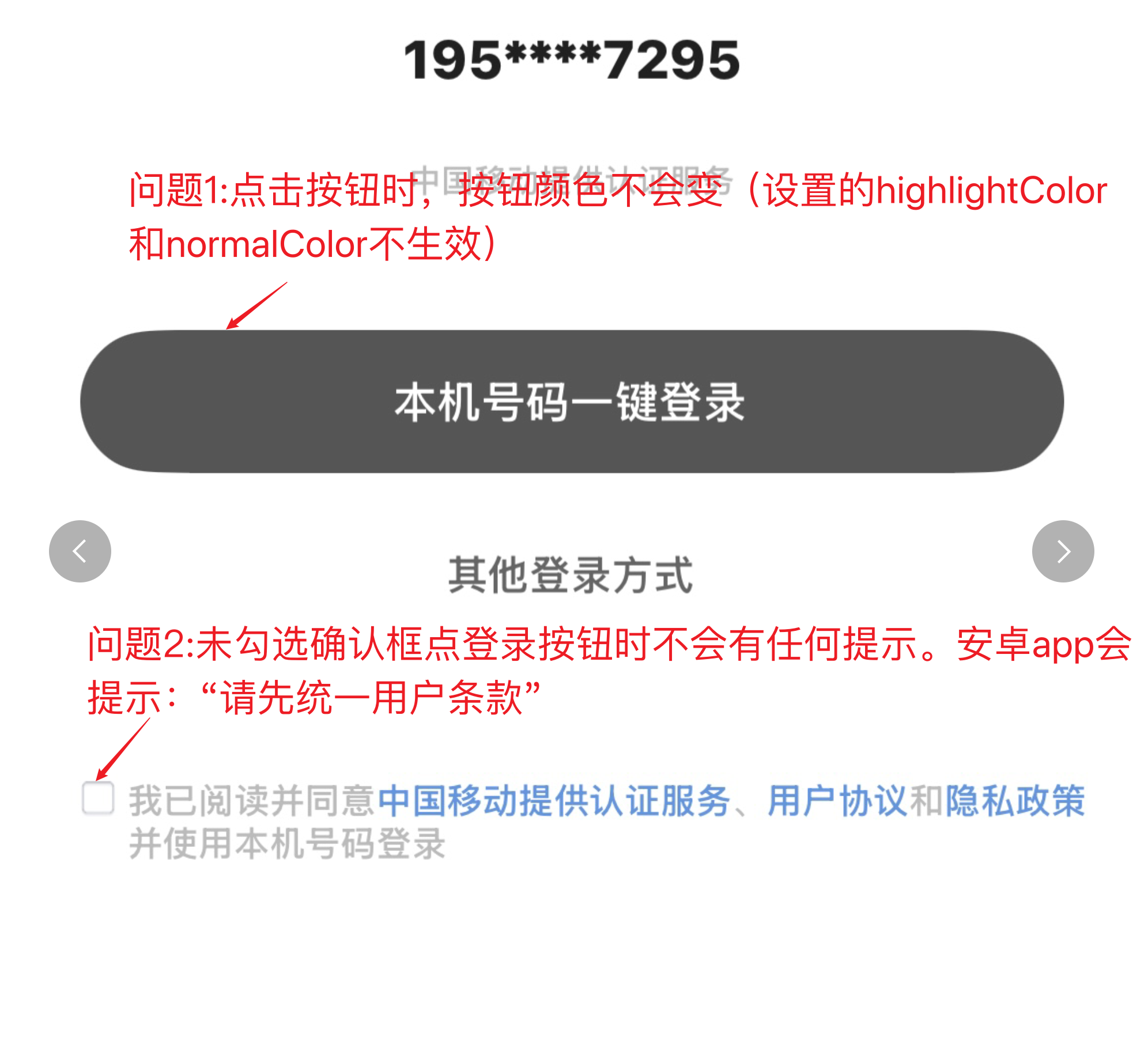 反馈iOS一键登录的几个小bug,安卓全都正常,就iOS有问题。我在图中都标注出来了,求解答。安装包是云打包