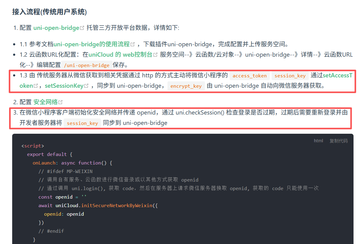 sessionKey:由微信登录凭证code换取,用于解密用户敏感数据(如手机号)。客户端通过uni.checkSession()检查其有效性(文档),过期需重新登录获取新code再换取。