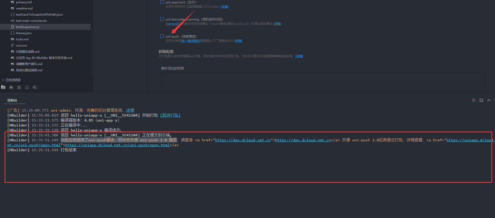 uni.getPushClientId、uni.onPushMessage等) - 完全移除相关代码后再取消勾选