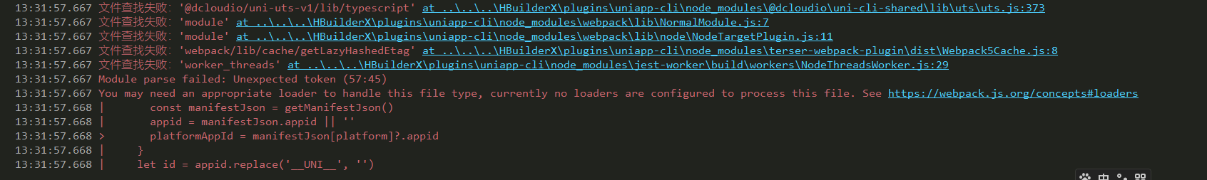 13:31:57.667 文件查找失败:'module' at ......\HBuilderX\plugins\uniapp-cli\node_modules\webpack\lib\NormalModule.js:7