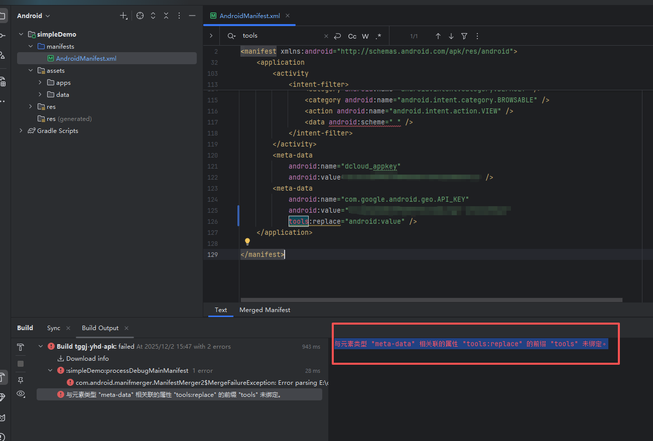 回复 DCloud_Android_zl: 还是不行 报错:与元素类型 "meta-data" 相关联的属性 "tools:replace" 的前缀 "tools" 未绑定。