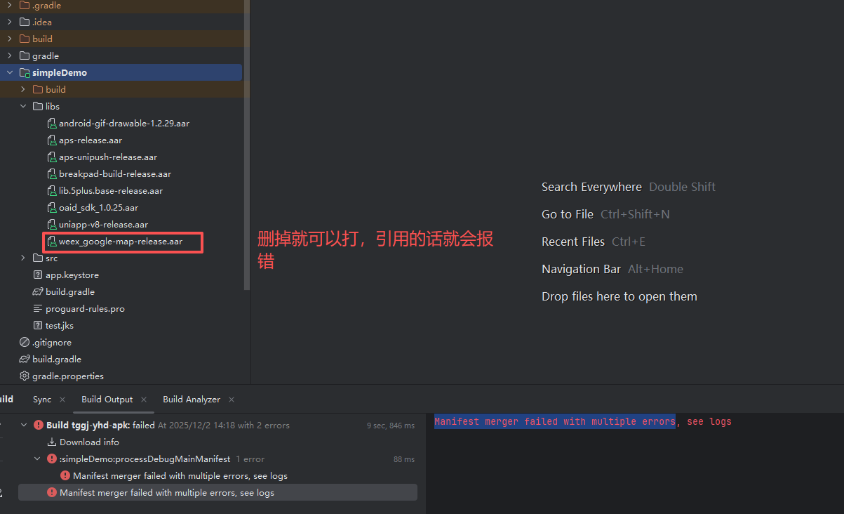 【报Bug】安卓本地离线打包引用weex_google-map-release.aar 包就会Manifest merger failed with multiple errors问题