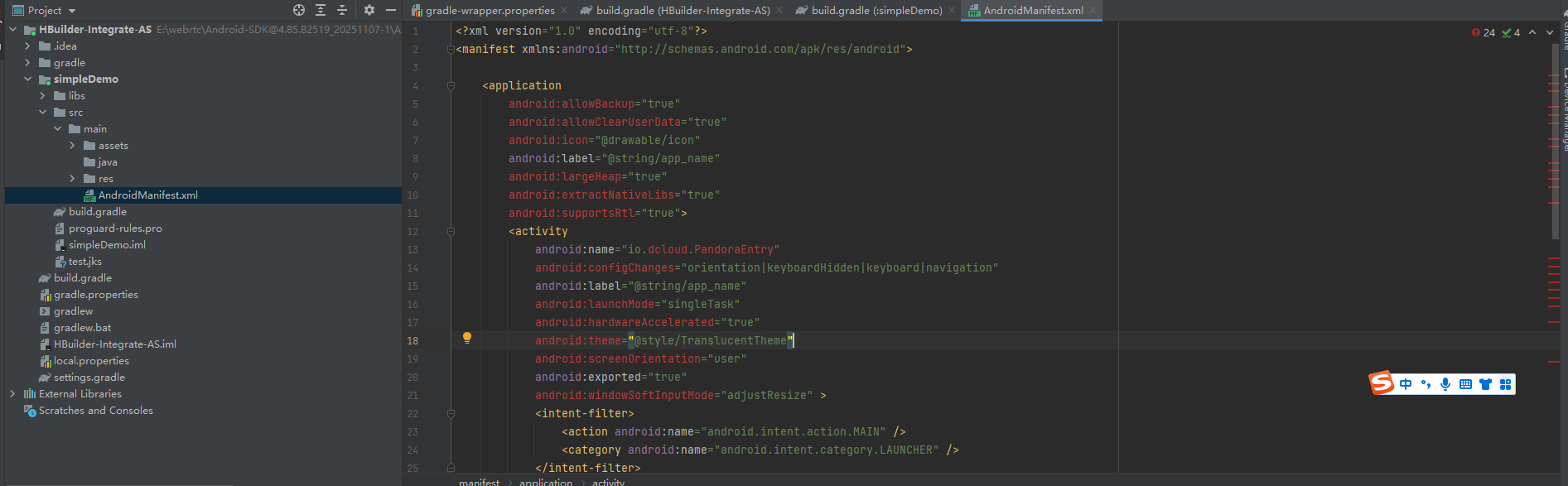 离线包4.85导入到AS中无法正常构建,AndroidManifest.xml全是红,AS版本2021.1.1