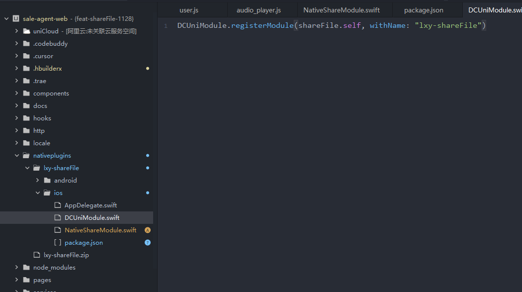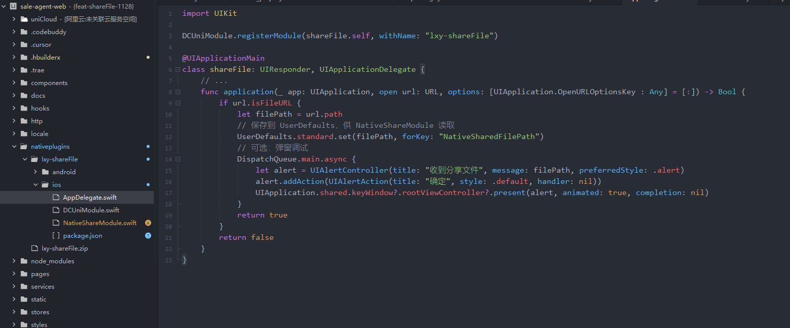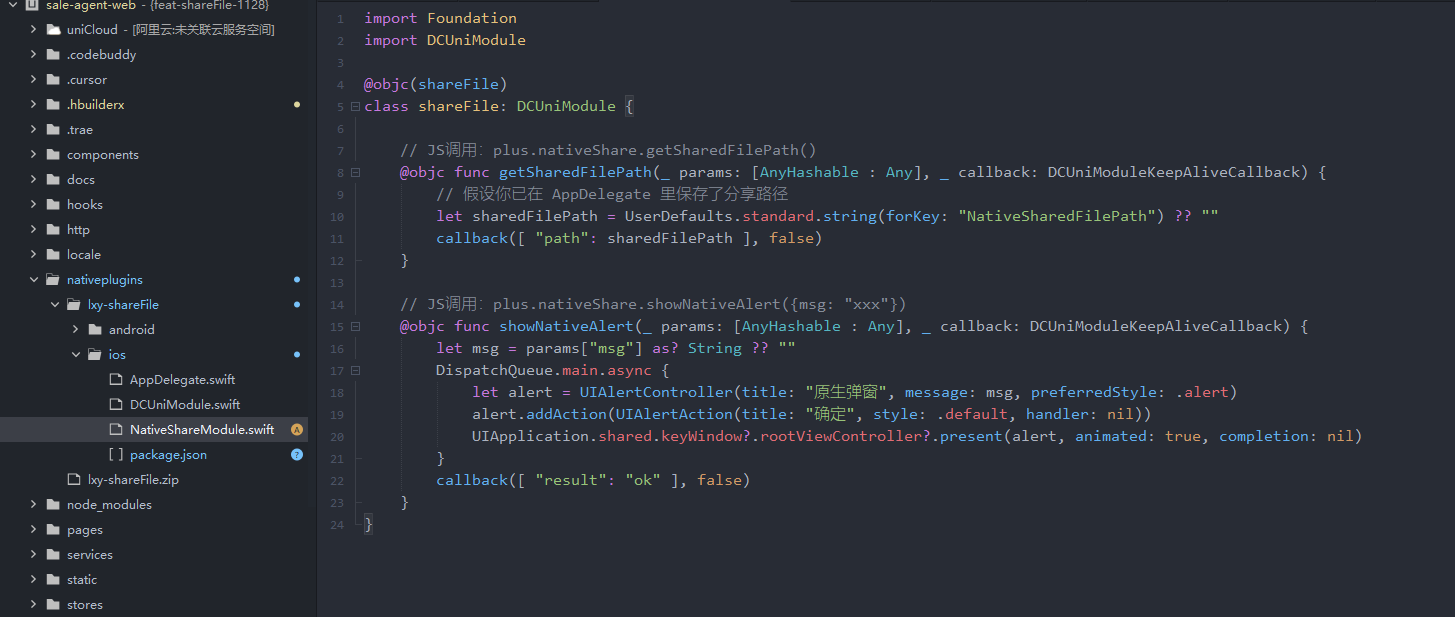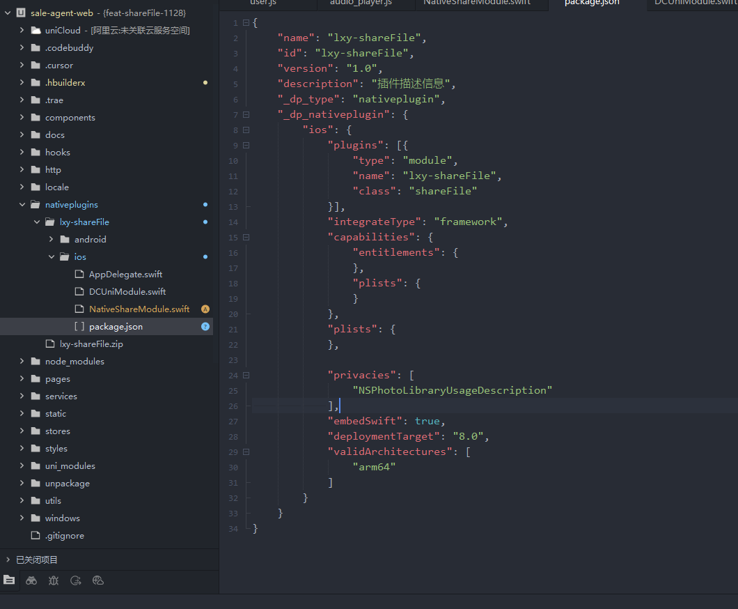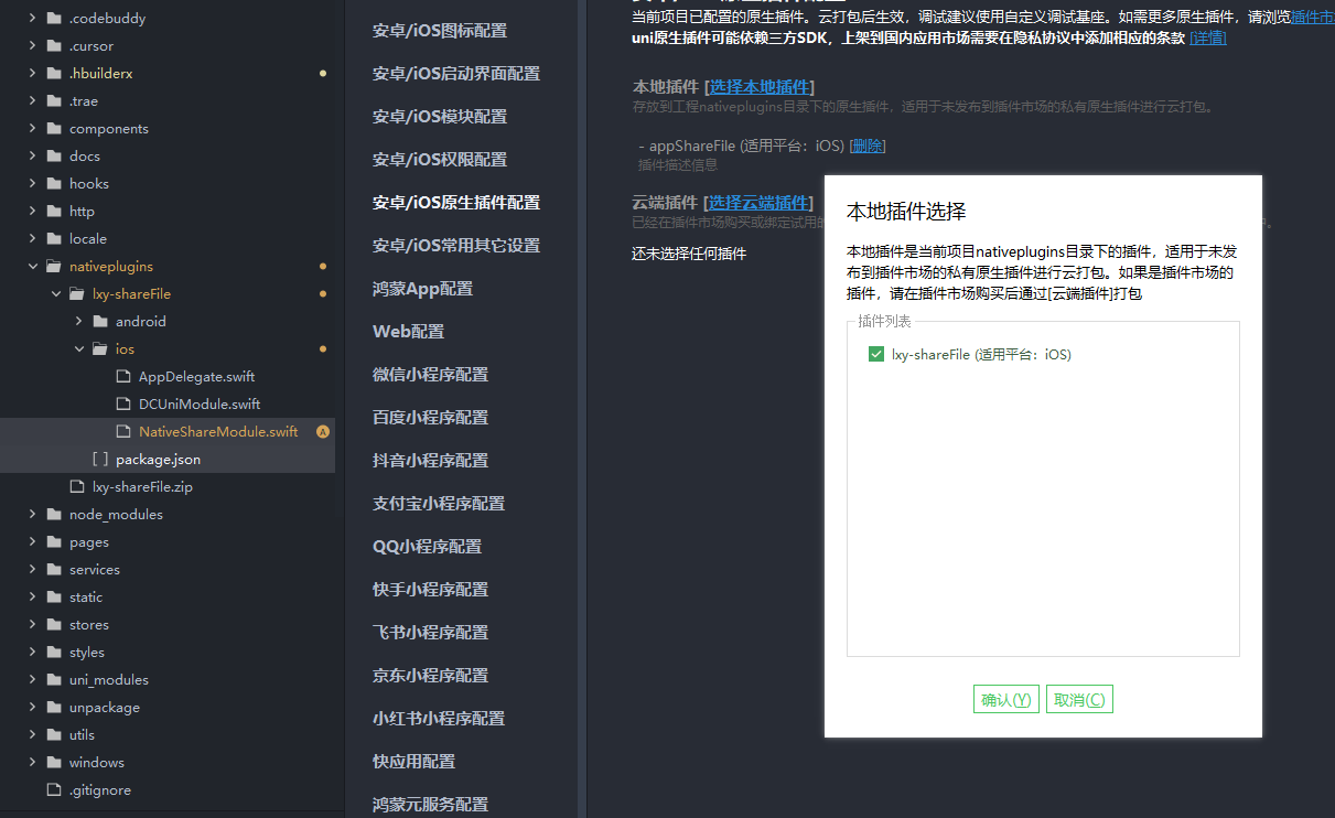 目前是只处理ios端的获取分享文件,打正式包,安装到手机上没反应,具体代码和目录结构,那个package.json文件我问了deepseek叫我放ios文件夹下,但是放进去检测不到这个插件,我又放到最外层了,然后截的manifest勾选这个插件,现在