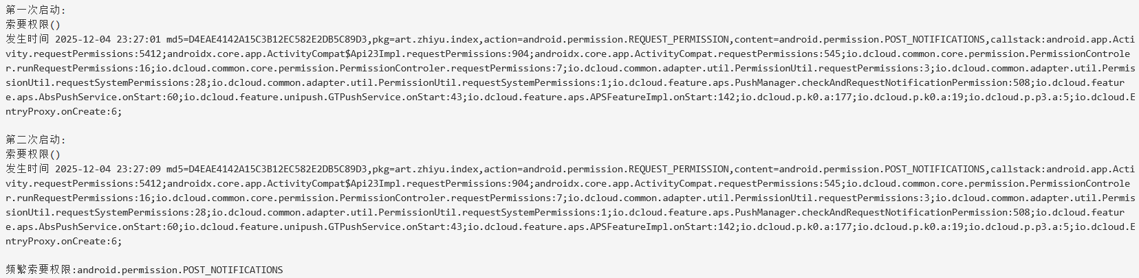 app-plus.distribute.android节点下添加"checkPermissionDenied": true,防止重复请求权限 syncDebug="false" androidPrivacy.json配置,确保通知权限请求延迟到用户同意隐私协议后 特别注意:小米商店要求必须在用户明确同意隐私政策后才能初始化推送SDK。建议暂时移除UniPush插件测试是否仍触发权限弹窗,以确认是否为插件问题。若问题持续,需检查插件源码或联系插件提供商更新合规版本。