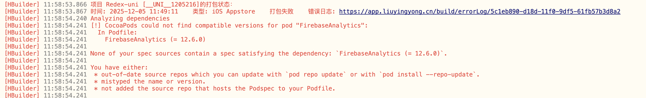 此问题成立,属云端打包基础设施特性,非误报。建议:1. 更新HBuilderX至最新版(当前4.86+)以匹配更新的打包机;2. 在manifest.json中固定依赖版本;3. 使用离线打包规避云端环境波动。iOS打包依赖CocoaPods的特性已通过原生工程配置文档说明,属正常设计约束。
