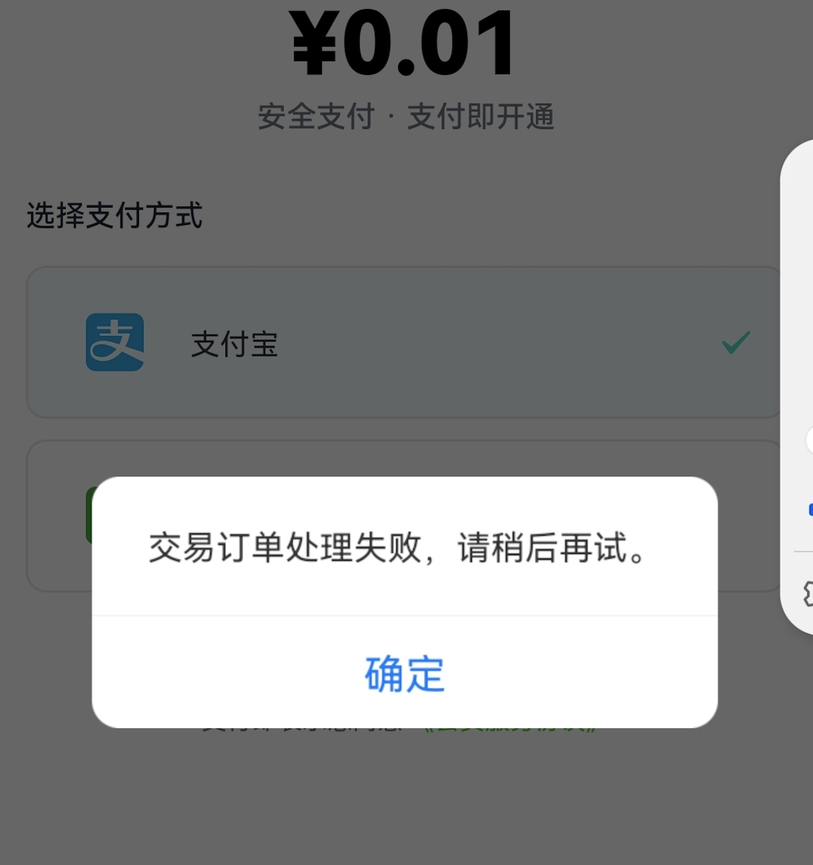 唤起支付宝APP支付时,出现错误弹窗(如下图),提示“交易订单处理失败,请稍后重试。”。