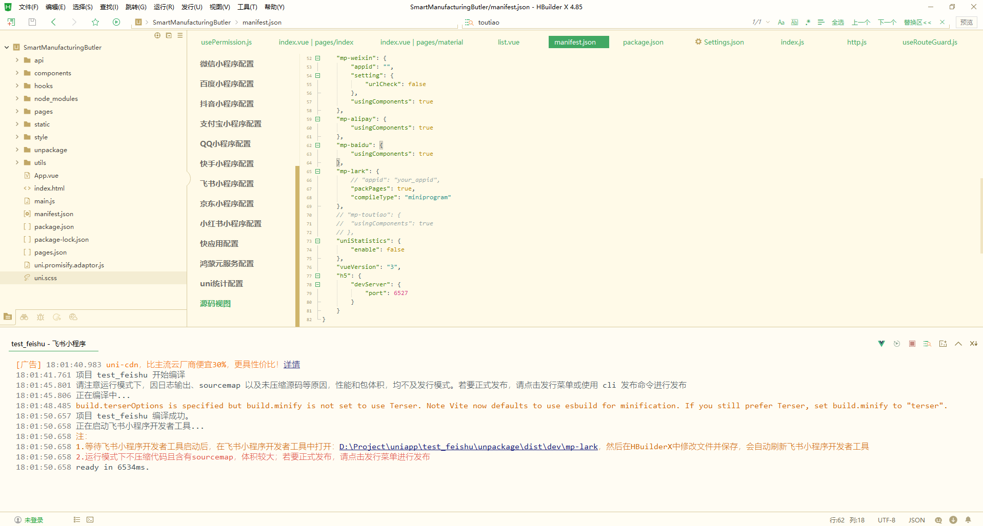 这些信息有助于定位问题所在。如果可能的话,也请确认是否已经按照官方文档进行了正确的配置。您可以参考uniapp关于飞书小程序编译运行的文档来检查是否有遗漏的地方。