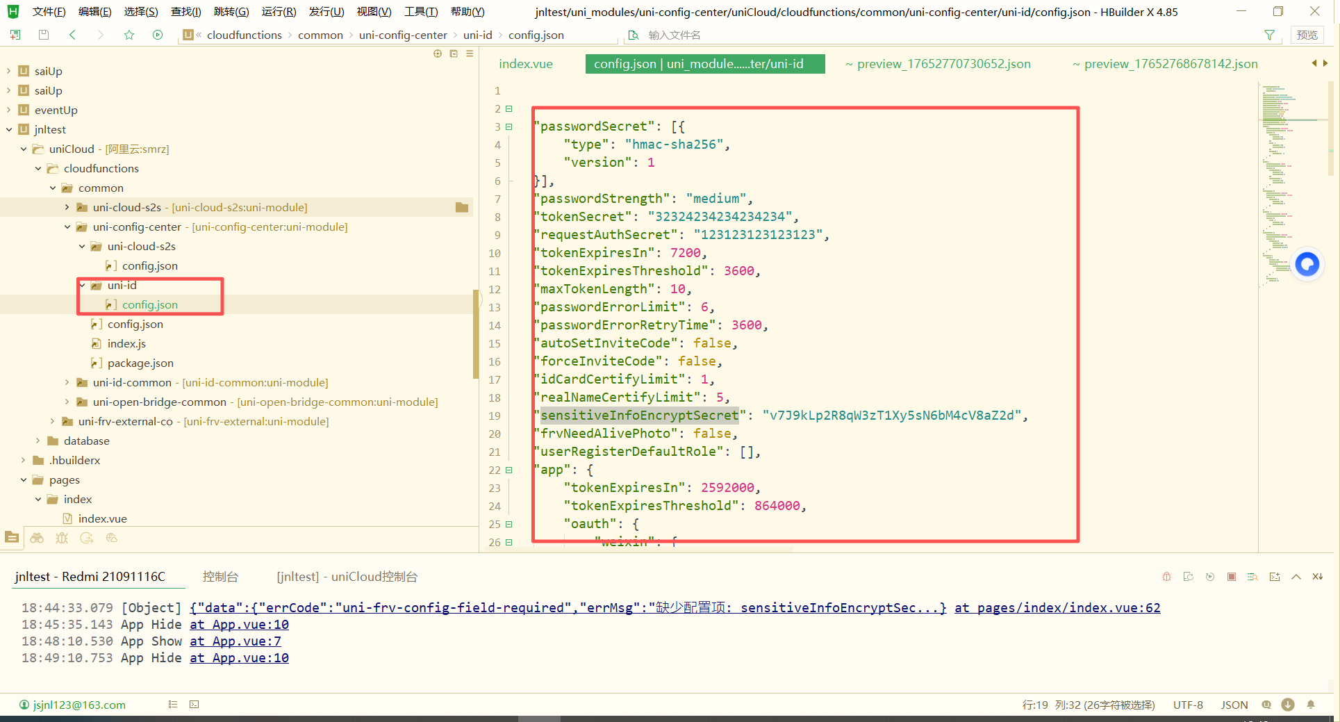 config.json已经正确上传到云端。 - 检查HBuilderX版本是否为最新版(当前正式版4.85)。