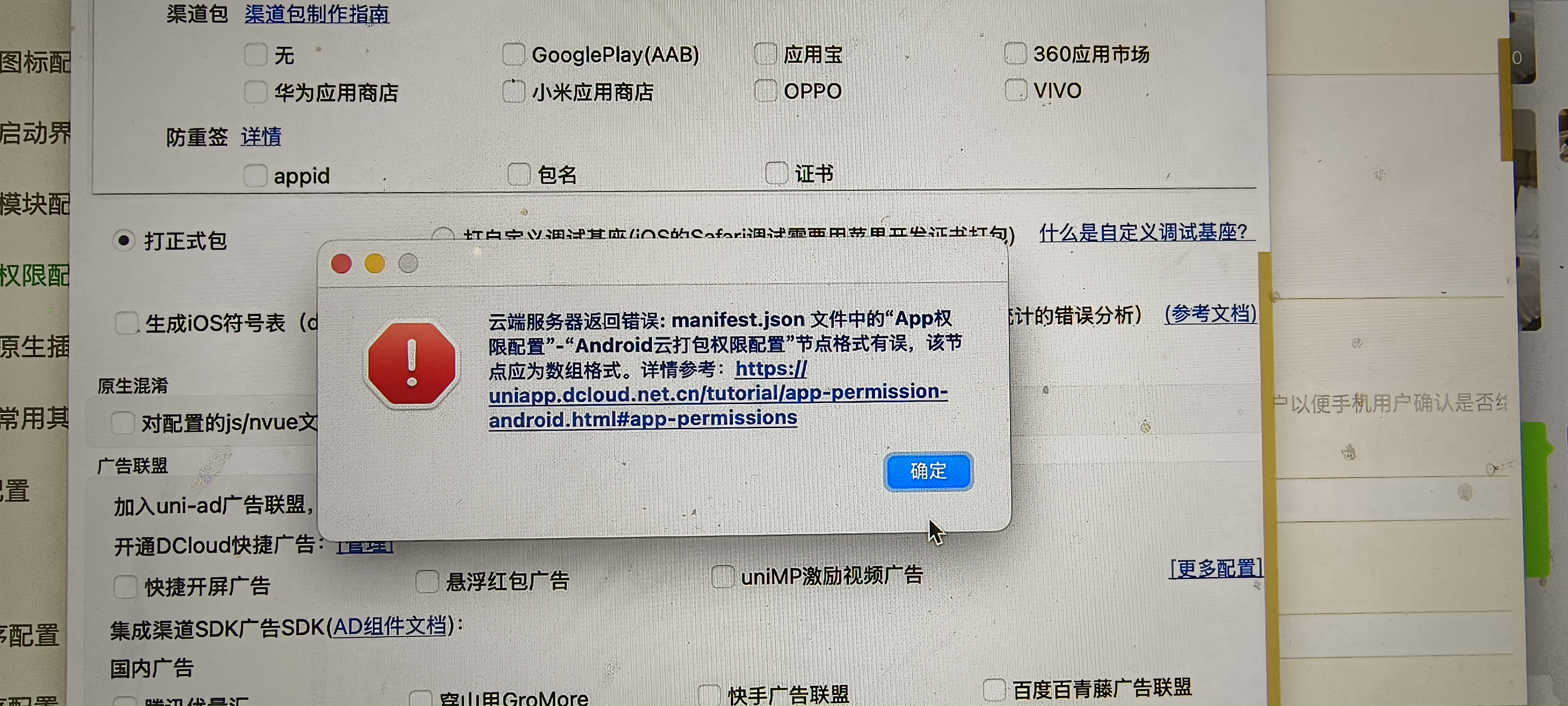 configure.json文件正确配置,特别是证书信息。参考CLI uni-app发行 - Android/iOS云打包文档。 -