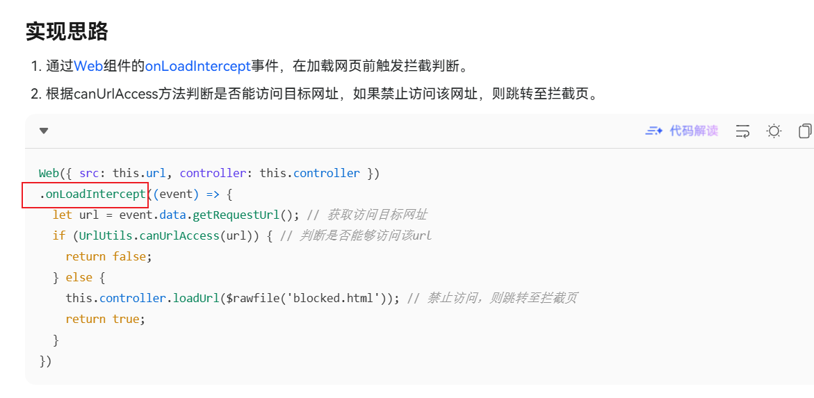 - 鸿蒙原生拦截API需查阅鸿蒙Webview文档