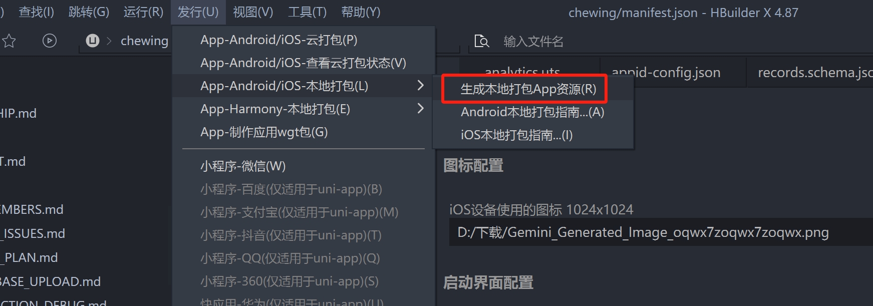 验证方法:在HBuilderX中点击【发行】->【App本地打包】->【生成本地打包App资源】,完成后查看