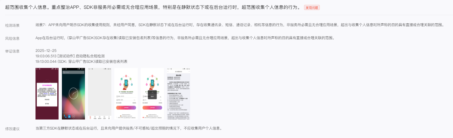 【报Bug】App在后台运行时,(穿山甲广告SDK)SDK存在收集(读取已安装包名列表)等信息的行为,非服务所必需且无合理应用场景,超出与收集个人信息时所声称的目的具有直接或合理关联的范围。