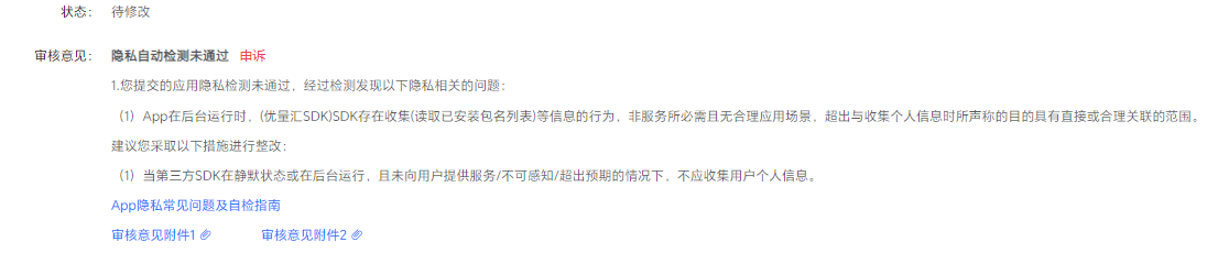 - 联系客服处理:发送应用名称、APP ID及商店驳回截图至uniad@dcloud.io,uni-ad团队将协助与穿山甲平台沟通调整SDK行为(类似华为上架问题处理流程)。