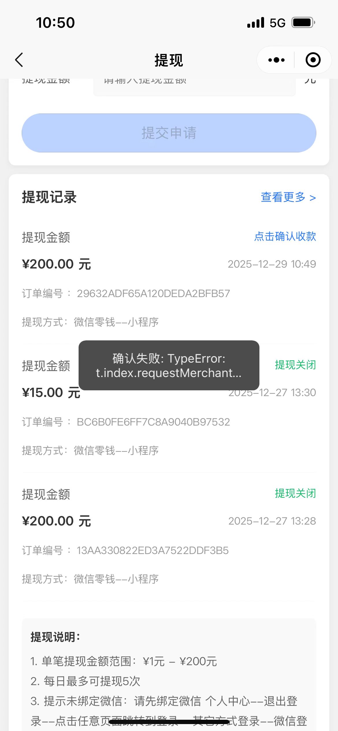 uni-requestMerchantTransfer在苹果手机有一些确认收款报错,我的源代码如下:
