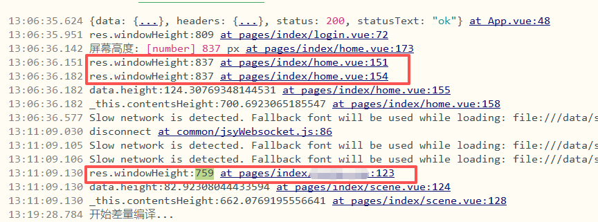 - 不同页面若存在导航栏/状态栏差异(如home.vue可能包含额外导航元素),会导致windowHeight值不同