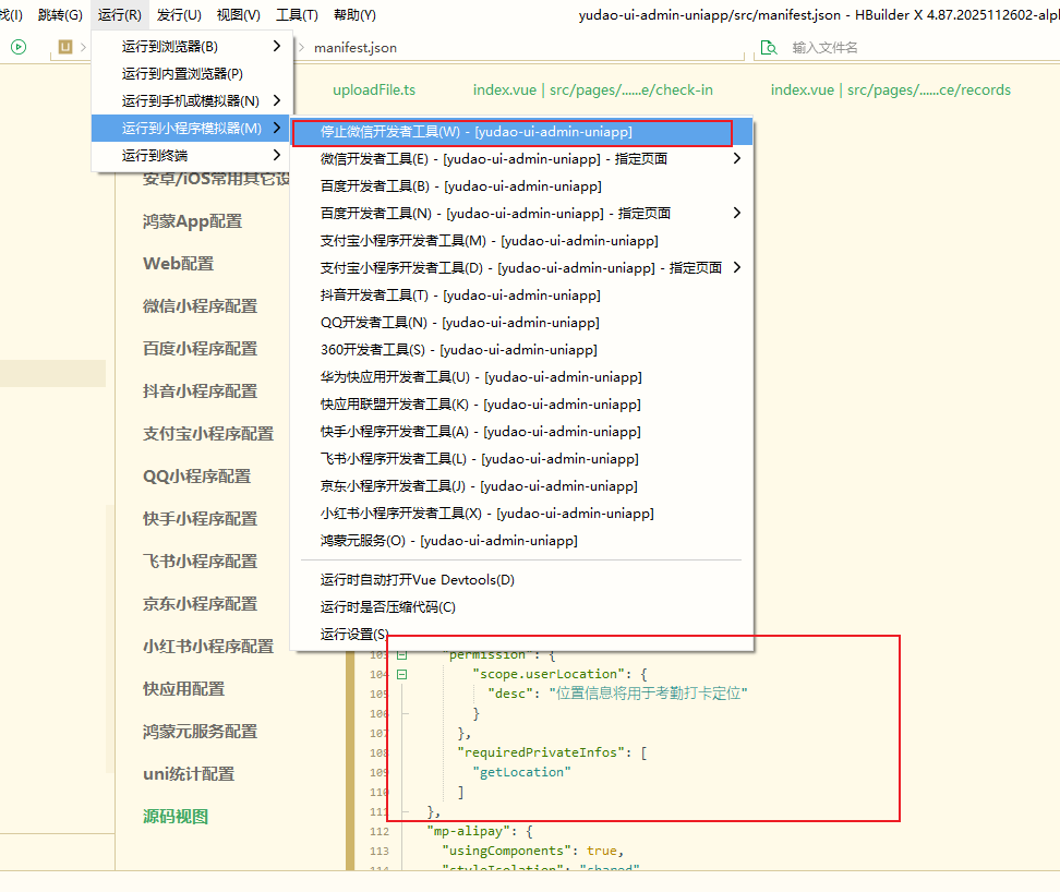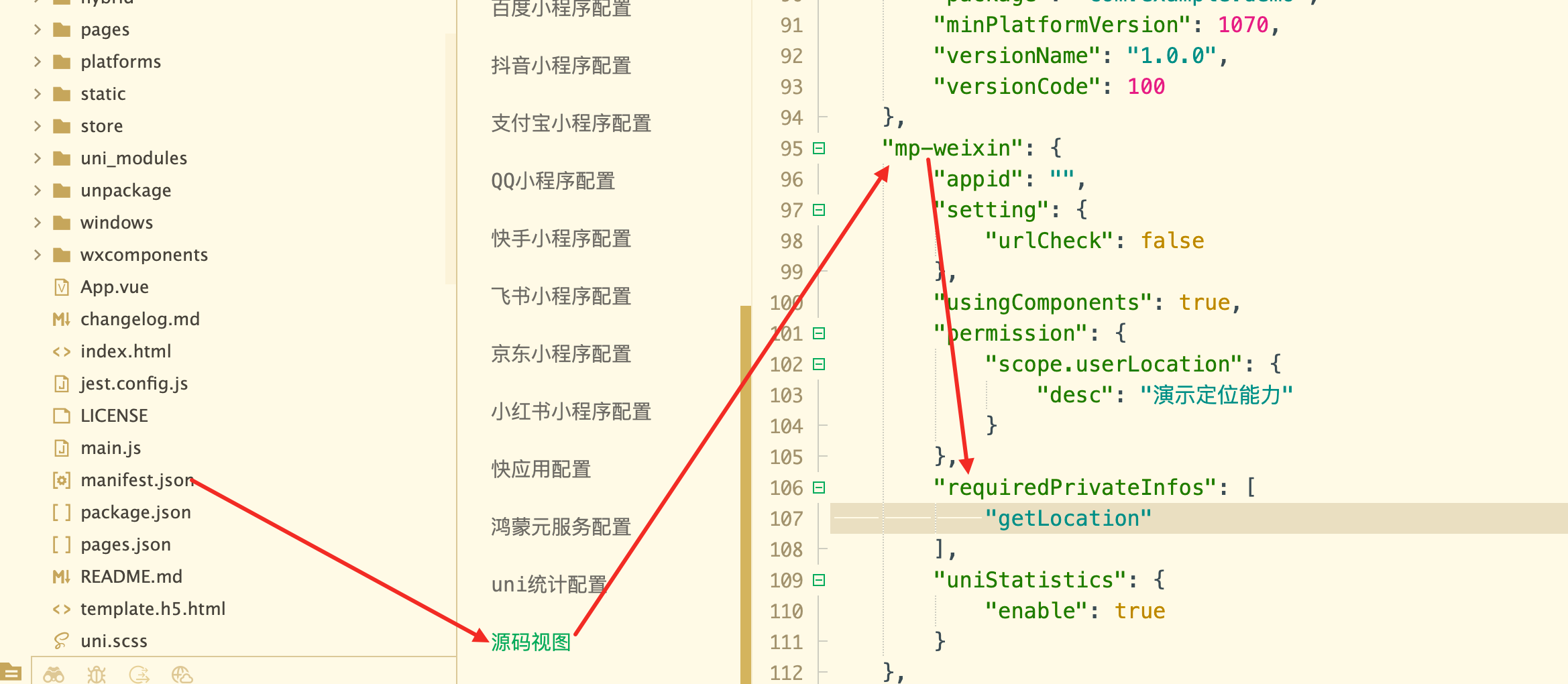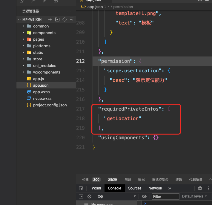 我需要在编译完毕前,微信开发者工具弹出前,把这些配置上面的定位配置手动加上,编译后的文件中app.json才会有那些配置,小程序才能使用定位功能。