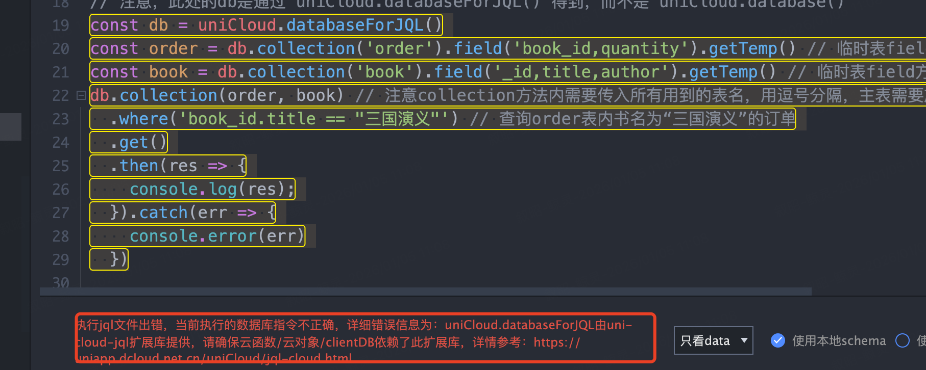 在项目uniCloud/database创建test.jql,输入以下官方的jql案例