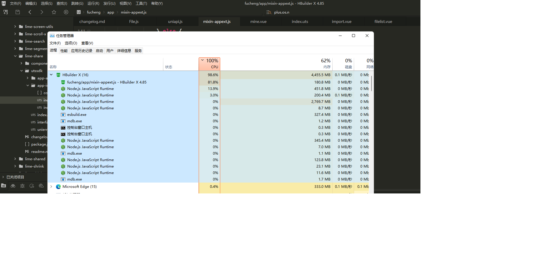 从知识库看,HBuilderX 4.85版本无已知高资源占用问题记录。建议用户: