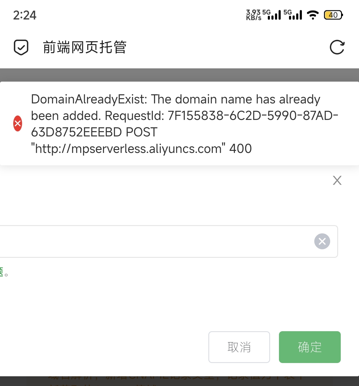 DomainAlreadyExist: The domain name has already been added. RequestId: 76FC8AB0-B86F-509B-9E7C-B163DD14DB68 POST "http://mpserverless.aliyuncs.com" 400