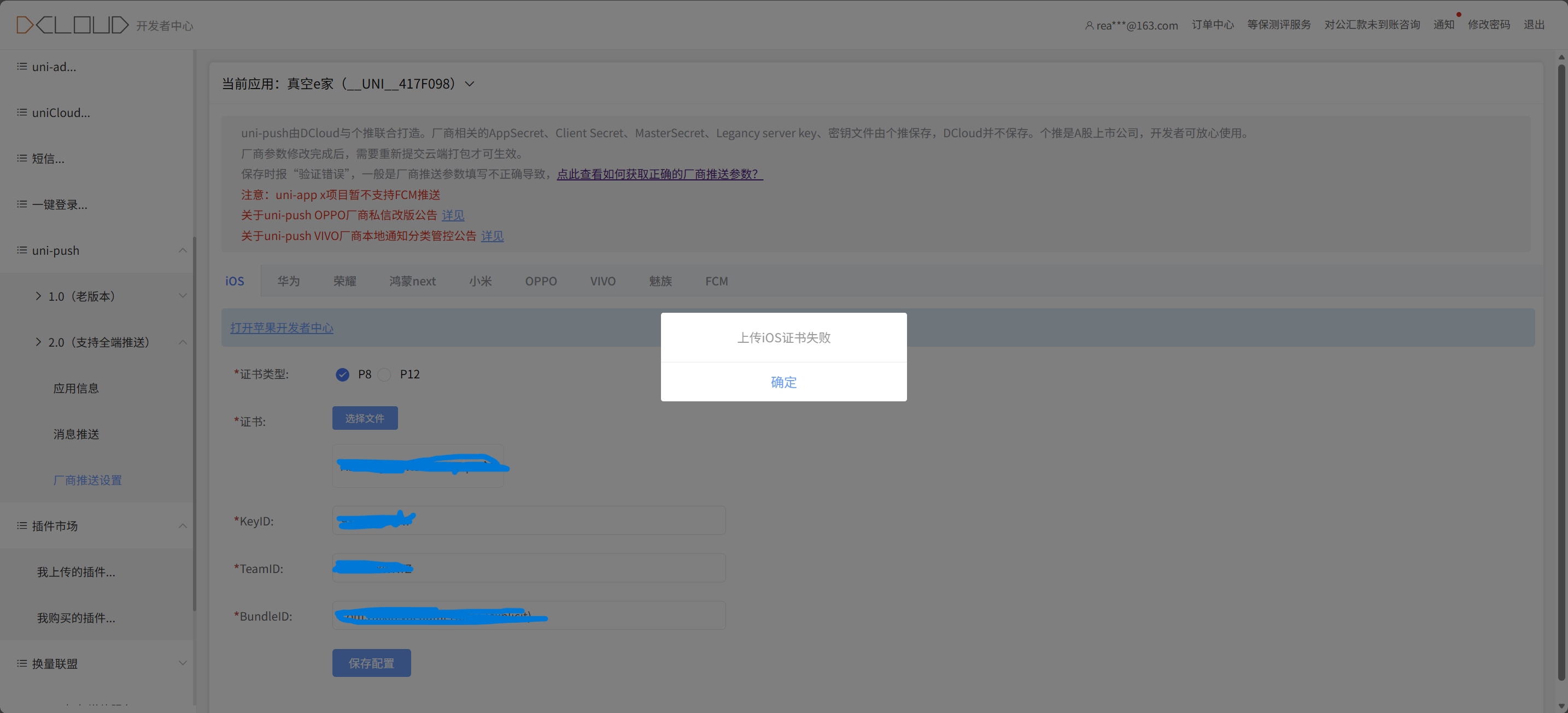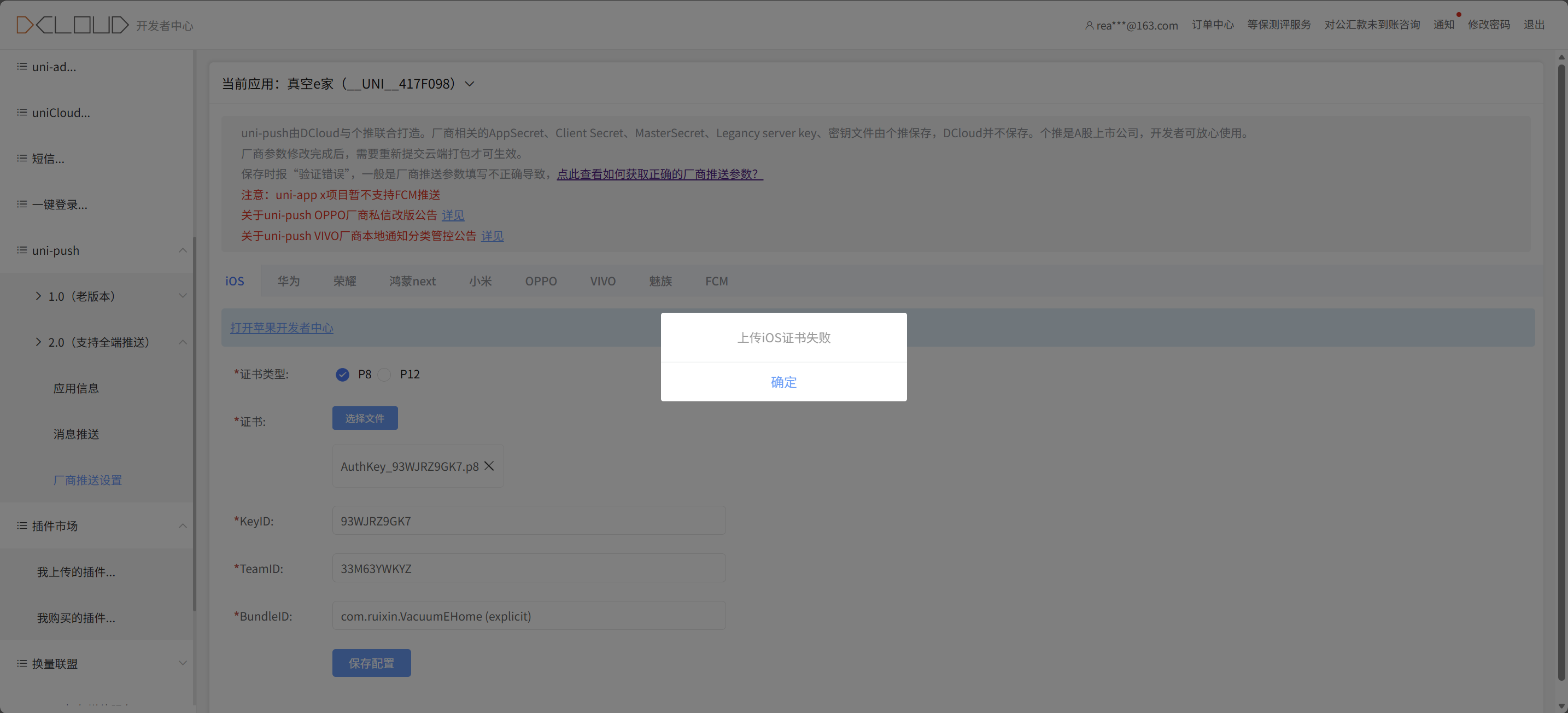 iOS平台使用uni-push需要上传专用的APNs推送证书(P8文件)。根据知识库信息,您遇到的问题可能由以下原因导致: