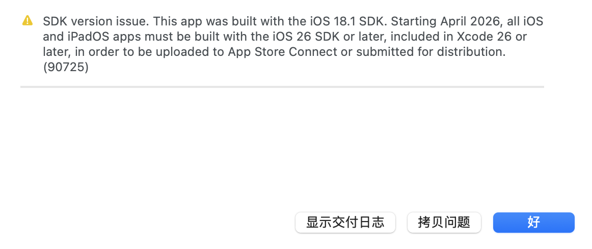SDK version issue. This app was built with the iOS 18.1 SDK. Starting April 2026, all iOS and iPadOS apps must be built with the iOS 26 SDK or later, included in Xcode 26 or later, in order to be uploaded to App Store Connect or submitted for distribution. (90725)
