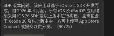 “当前 ipa 是用 iOS 18.1 SDK 打的,但从 2026-04 起必须升级到 iOS 26 SDK(Xcode 26+)才能继续提交。”