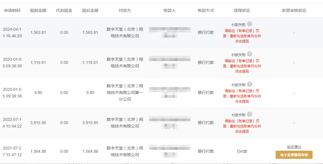 付款失败详细内容是“你提交的广告联盟提现申请未通过审核。原因:发票审核失败,请检查邮寄的发票或上传的电子发票是否正确,感谢你的理解与配合,谢谢! ”