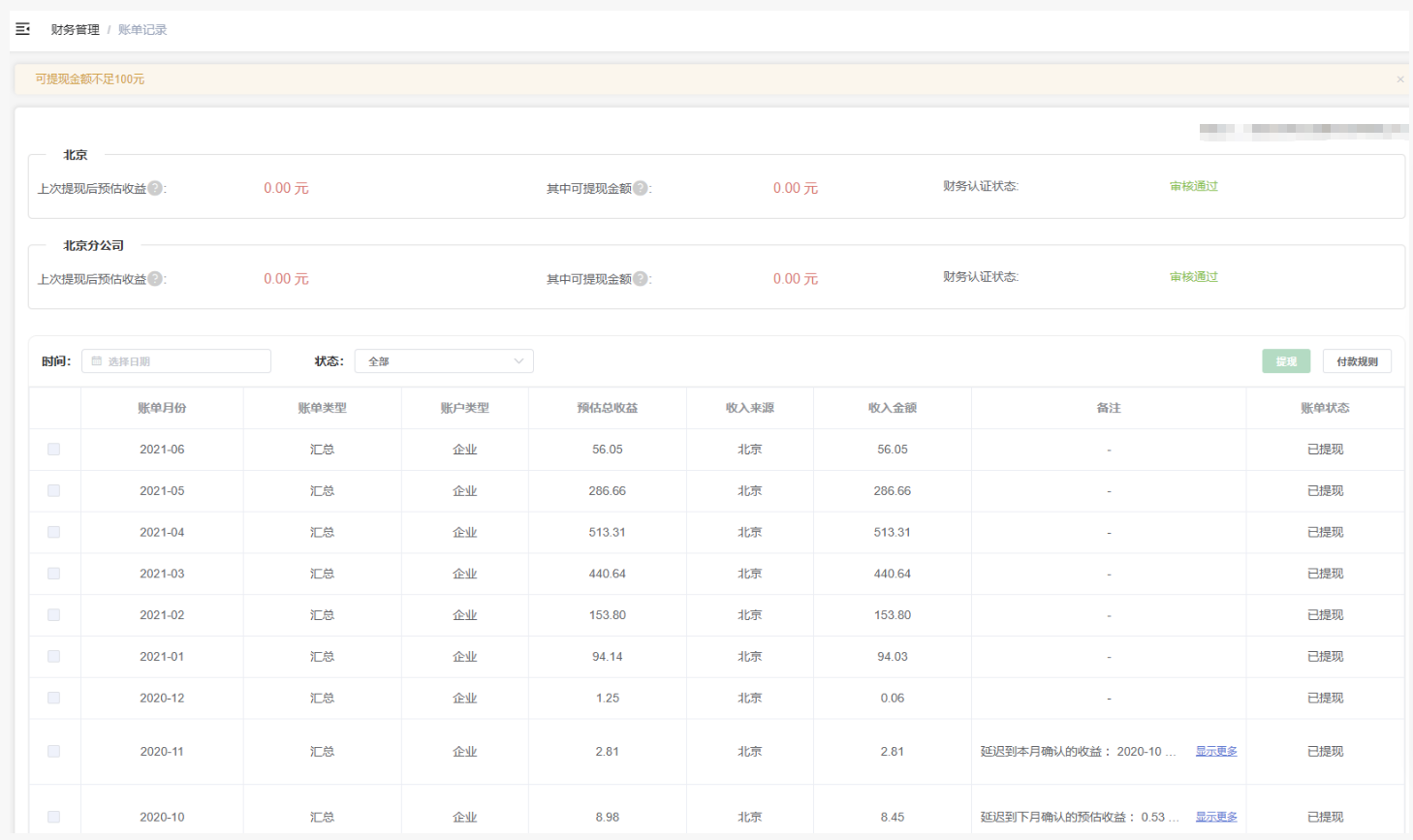 账单记录看不到2022年之后的记录,导致无法提现