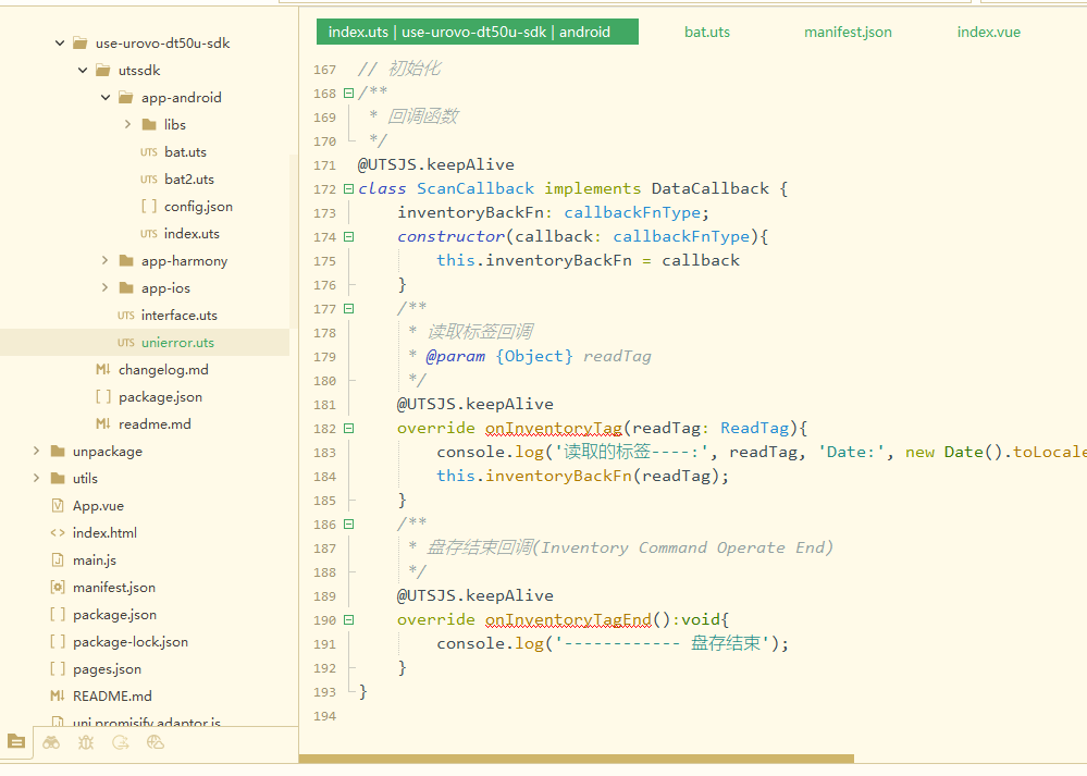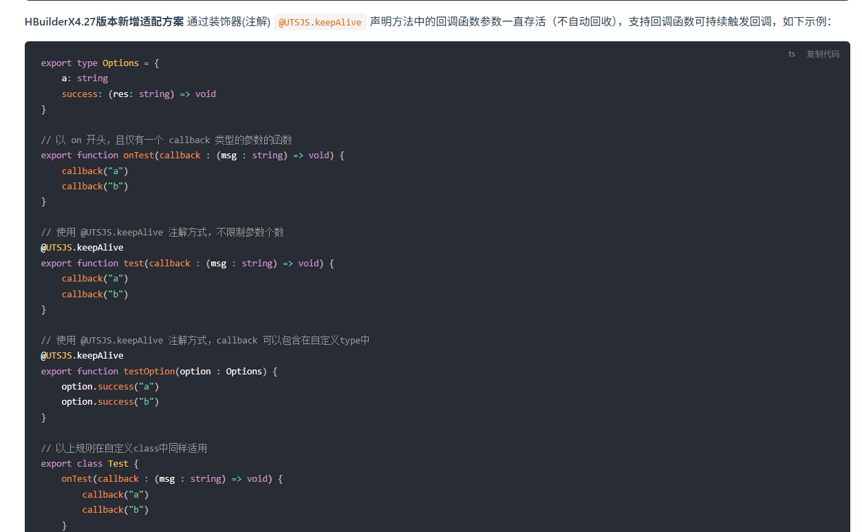 on 开头,且只有一个 callback 参数; @UTSJS.keepAlive 装饰器(4.27+ 才支持)。 @UTSJS.keepAlive 不支持 export const test = () => {} 这种写法,必须使用 export function test() {}。 @UTSJS.keepAlive,否则会在某一端失效。 @UTSJS.keepAlive