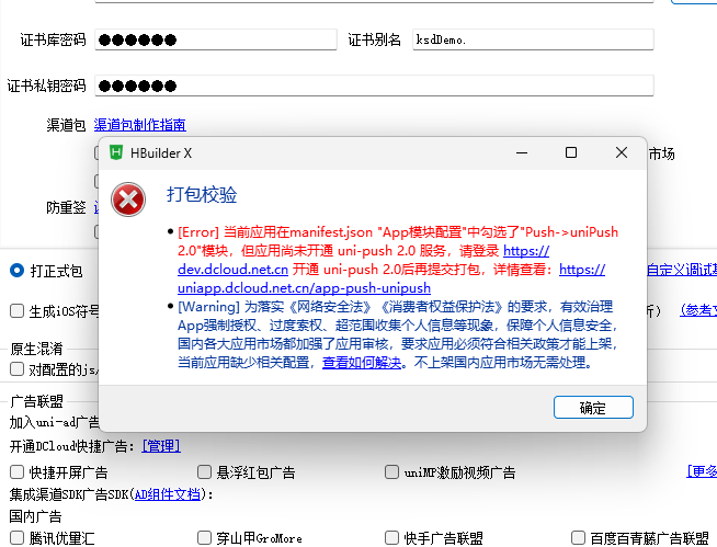 打包日志里若出现uni-push2.0 service ok字样即表示校验通过。 -