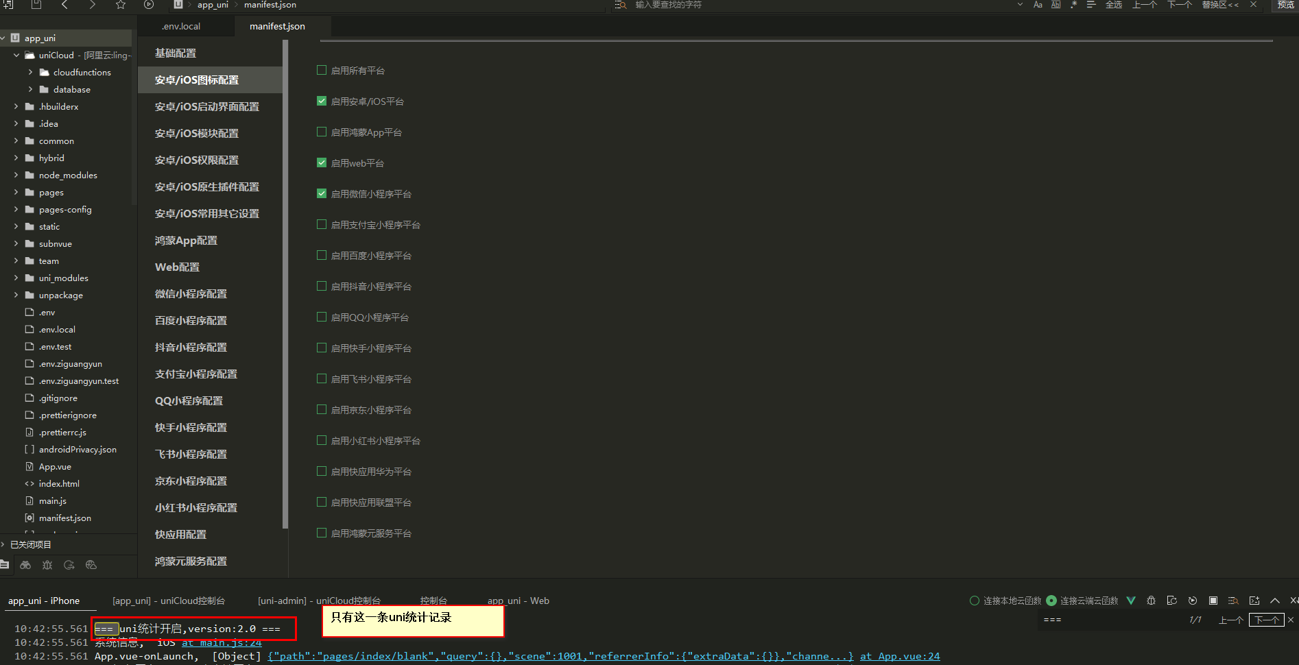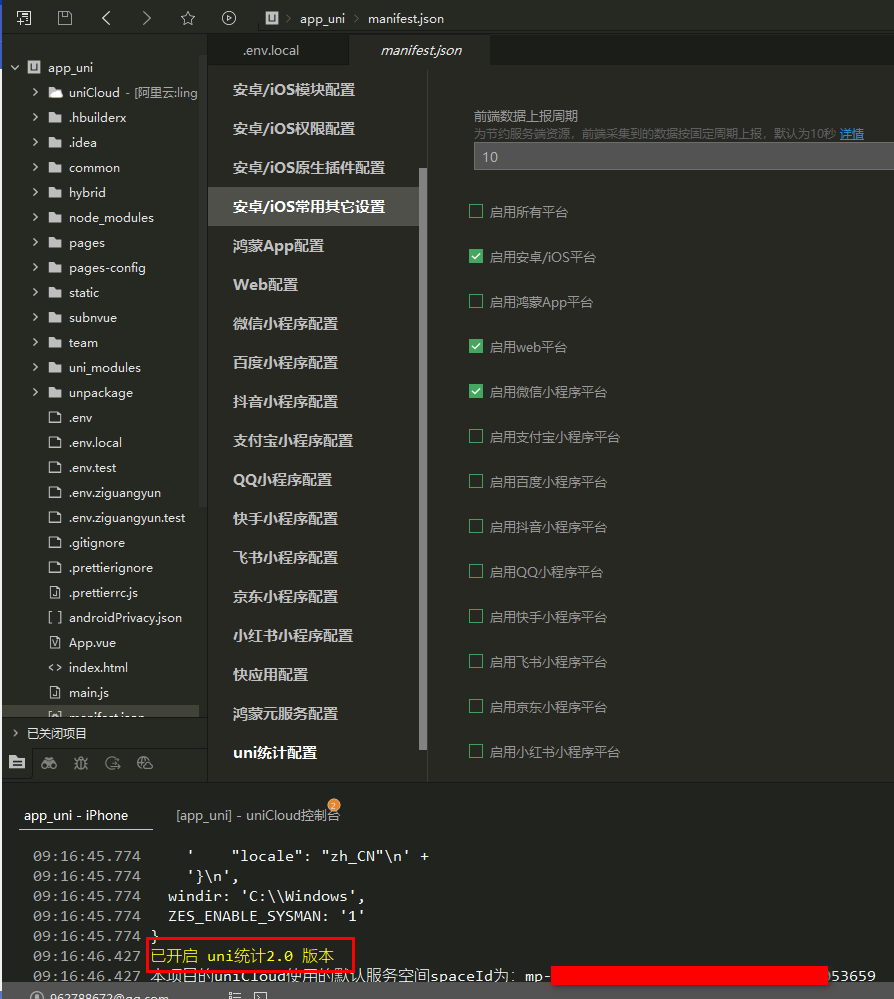 然后重新打的基座,真机运行,提示已开启uni统计2.0