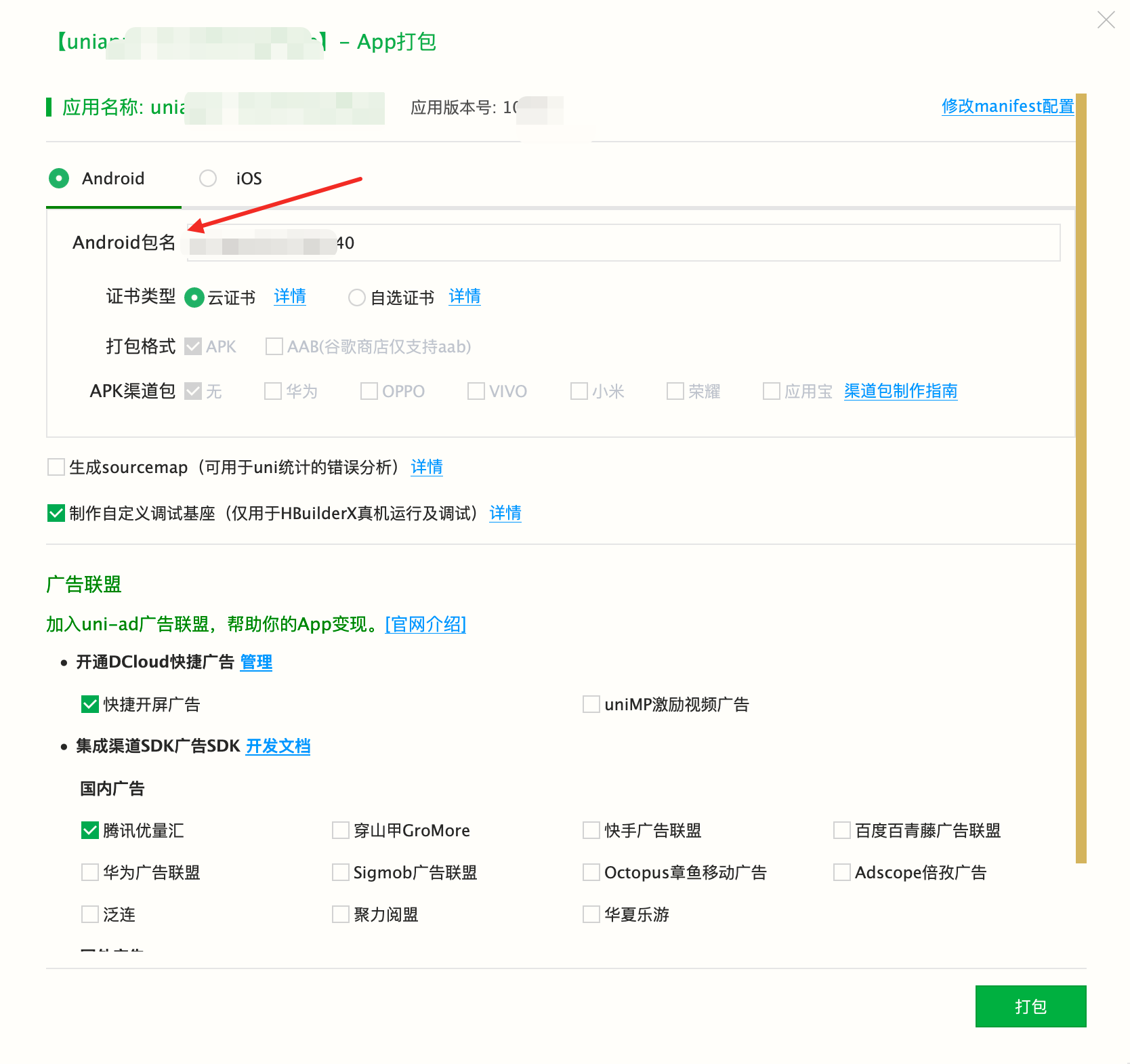 uni-app x 的包名(Android 的 applicationId / iOS 的 bundleIdentifier)只能在「发行 → 云打包」的可视化界面里修改,直接在 manifest.json 源码里写 android_package_name 或 ios_bundle_identifier 不会生效。