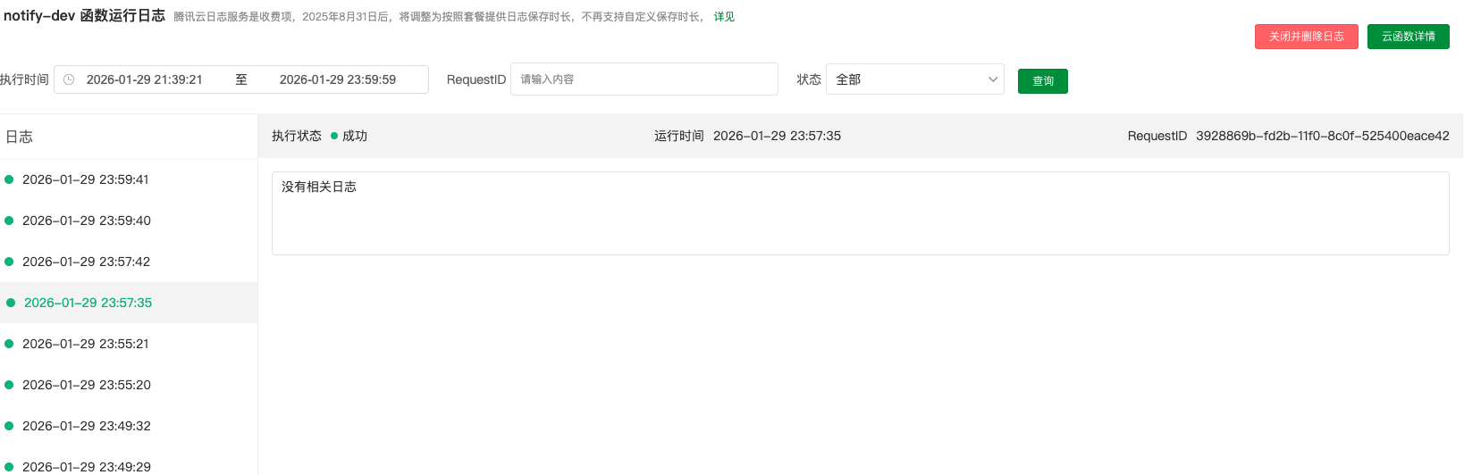 腾讯云的服务空间从 2022-10-25 起默认关闭了云函数日志,而日志在腾讯云是按量计费项目,需要手动打开才会产生和保存。