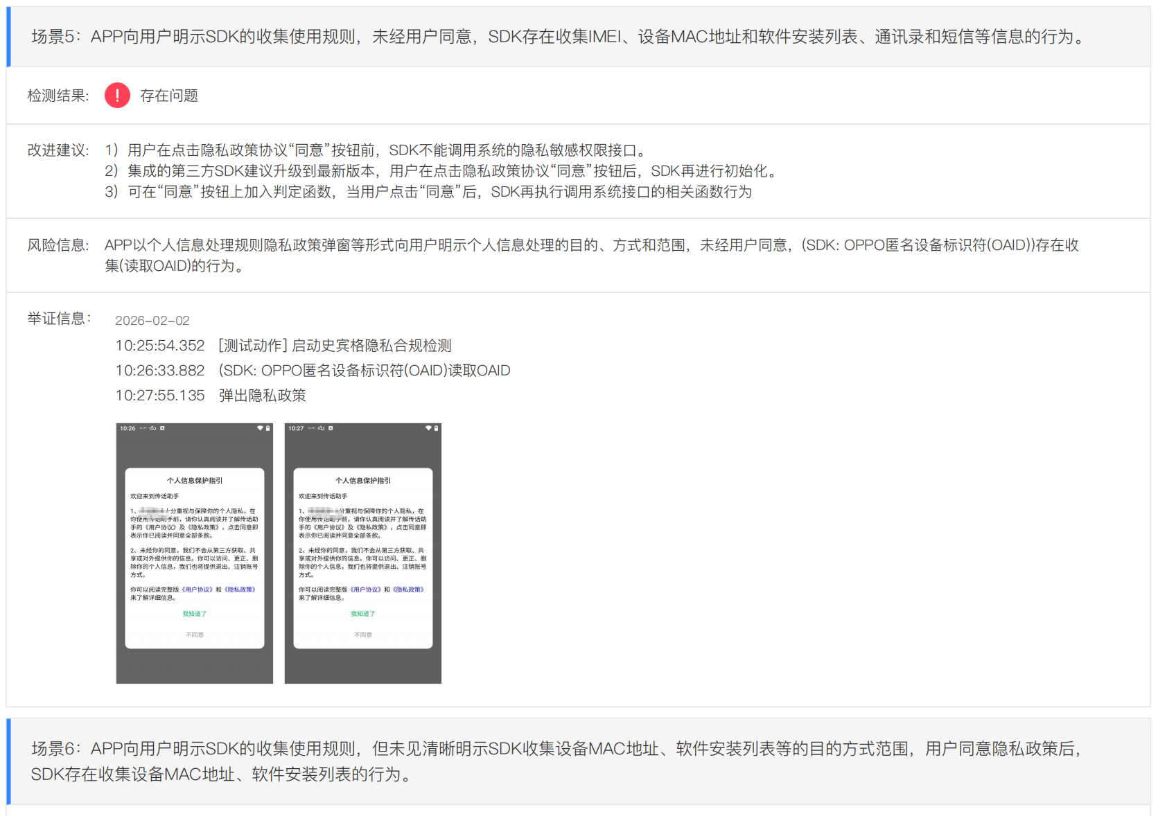 - OPPO 检测报告(含违规 SDK 名称、调用栈)。