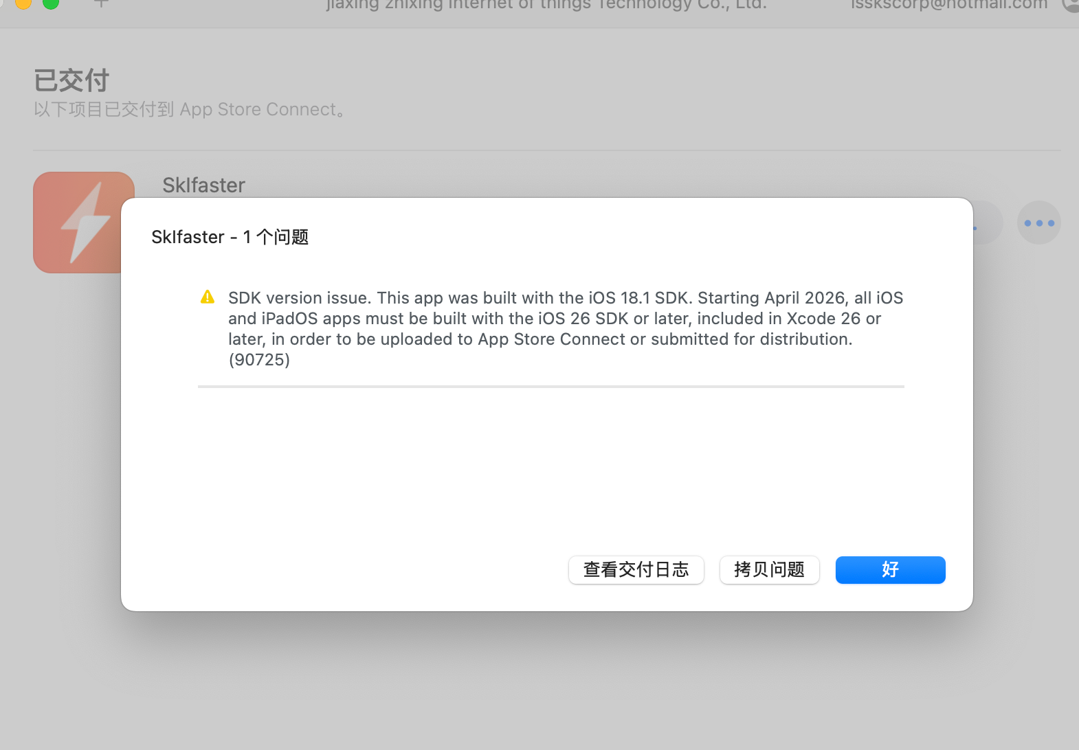 因此,你现在收到的 90725 警告只是提示“2026 年 4 月起才强制要求 iOS 26 SDK”,目前不会影响 App Store 审核与上架,也无需立即处理。