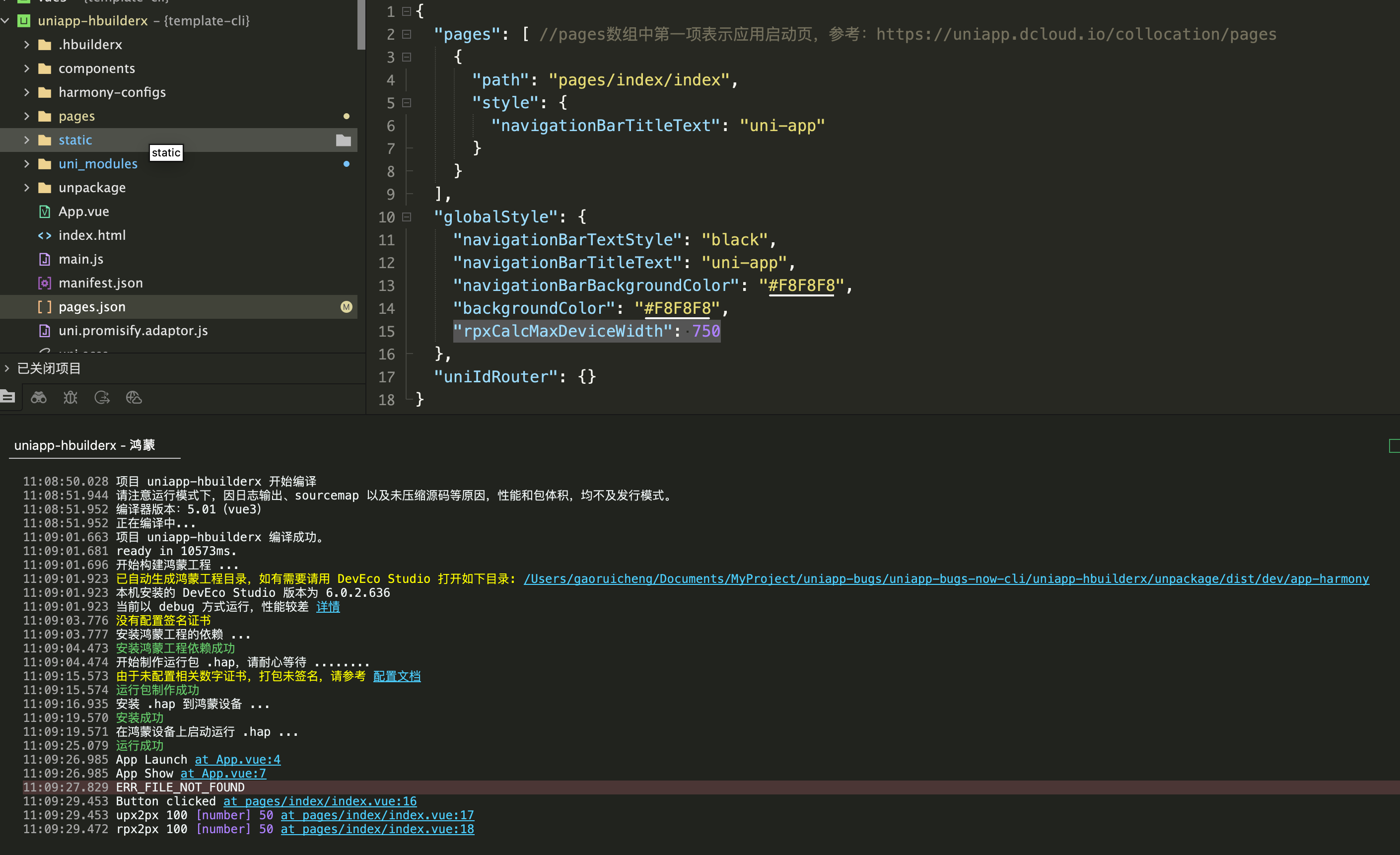 uni.upx2px,但实现逻辑未与uni.rpx2px保持一致;rpxCalcBaseDeviceWidth为 750 时,upx2px(100)返回 100(未按 750→375 缩放),而rpx2px(100)返回 50(正确缩放),两者应相等;综上,BUG 成立,属鸿蒙端特有实现缺陷。