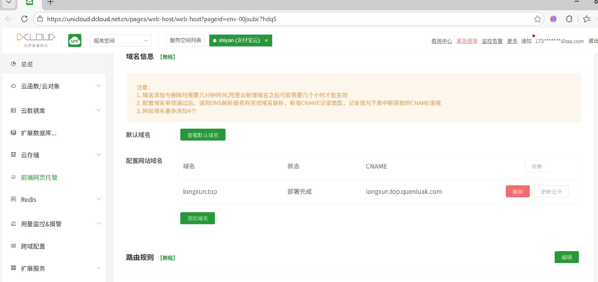 - 登录 unicloud web 控制台 → 前端网页托管 → 域名管理 → 添加域名。