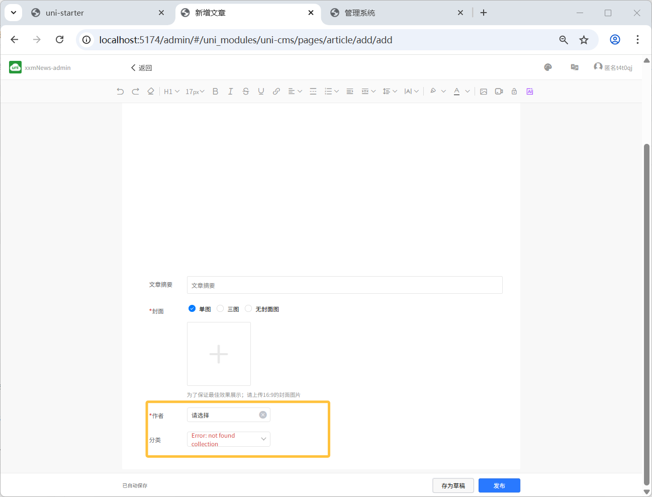 以上步骤在官方文档 uni-cms 二次开发目录结构说明 和 多作者登录 中均有对应描述,请严格对照。