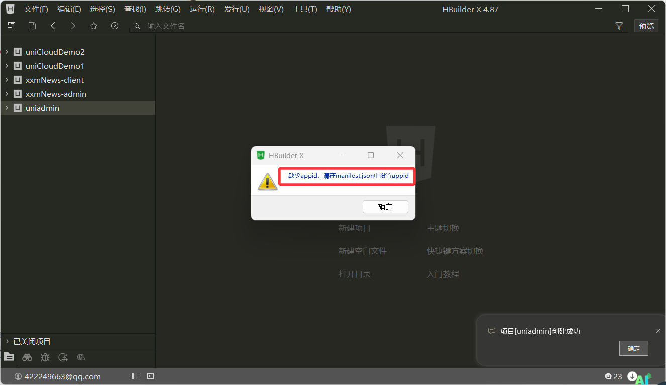 uni-admin 创建项目时提示“缺少 appid,请在 manifest.json 中设置 appid”,是因为当前项目没有配置 DCloud 平台的 AppID。