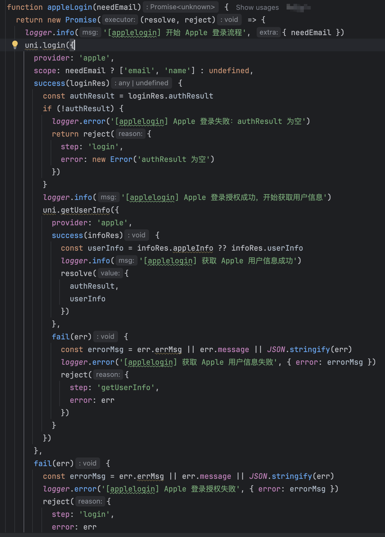 根据app收集到的日志显示,报错信息为 login:fail Oauth_apple:Error Domain=com.apple.AuthenticationServices.AuthorizationError Code=1000 \"(null)\"