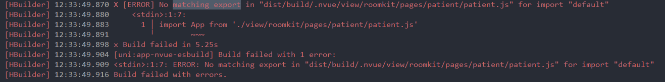 <stdin>:1:7: ERROR: No matching export in "dist/build/.nvue/view/roomkit/pages/patient/patient.js" for import "default"