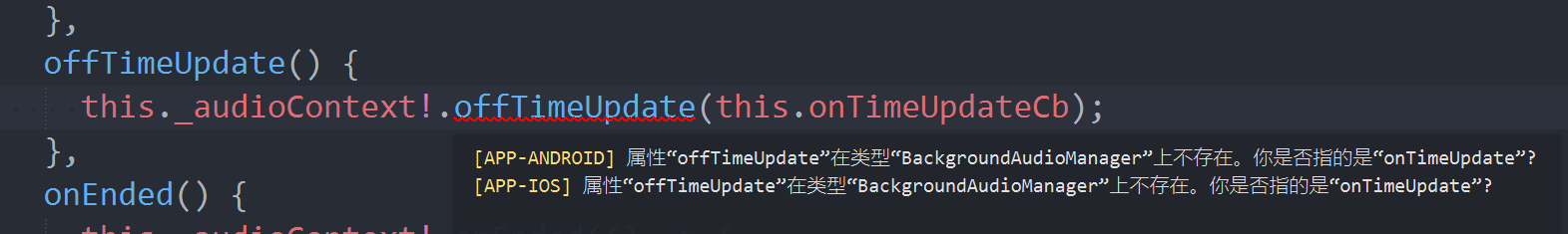 offTimeUpdate方法,但实际编译时提示该方法在BackgroundAudioManager类型上不存在。 -