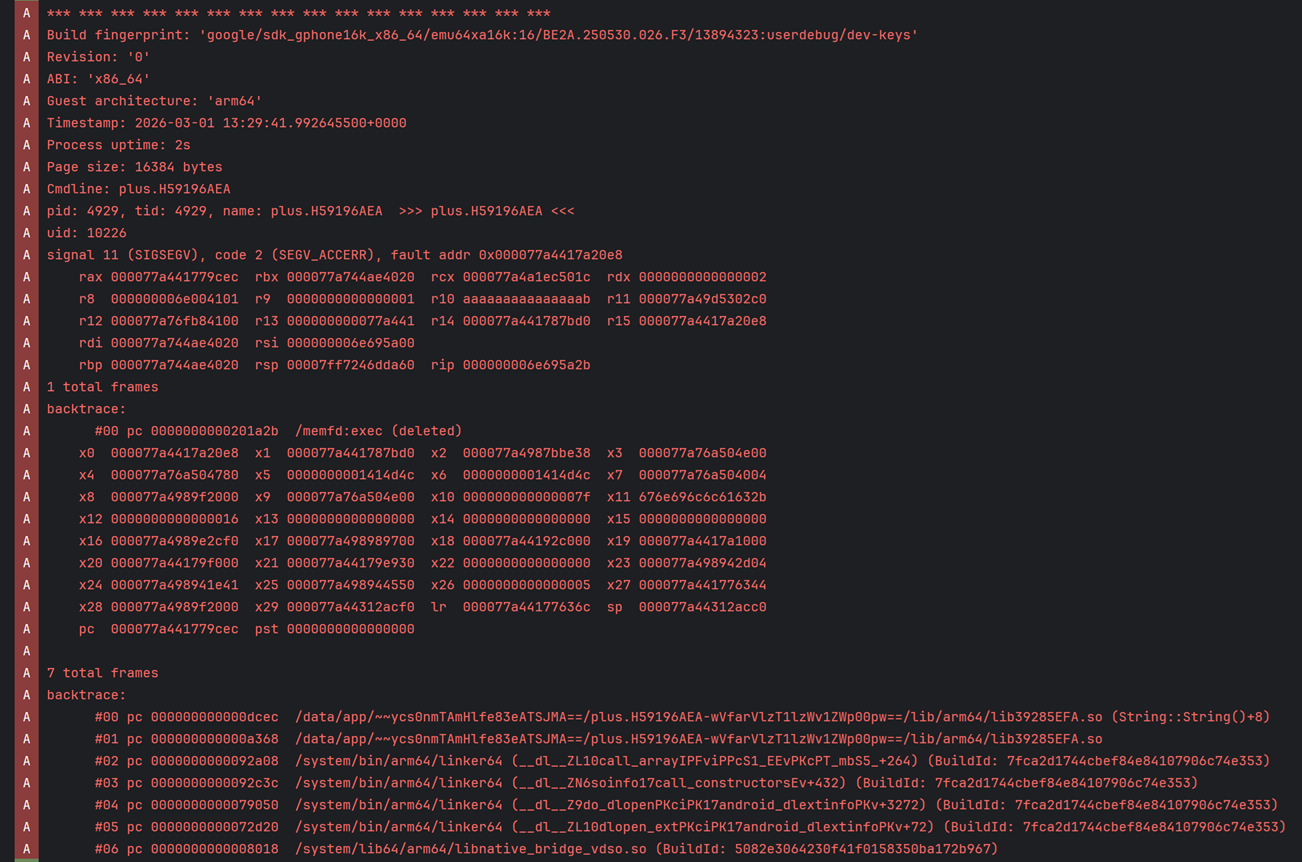 | BUG 描述 | 描述了现象(闪退、SIGSEGV)、架构(arm64)、页面大小(16KB),但未说明该 so 的来源或用途。 |