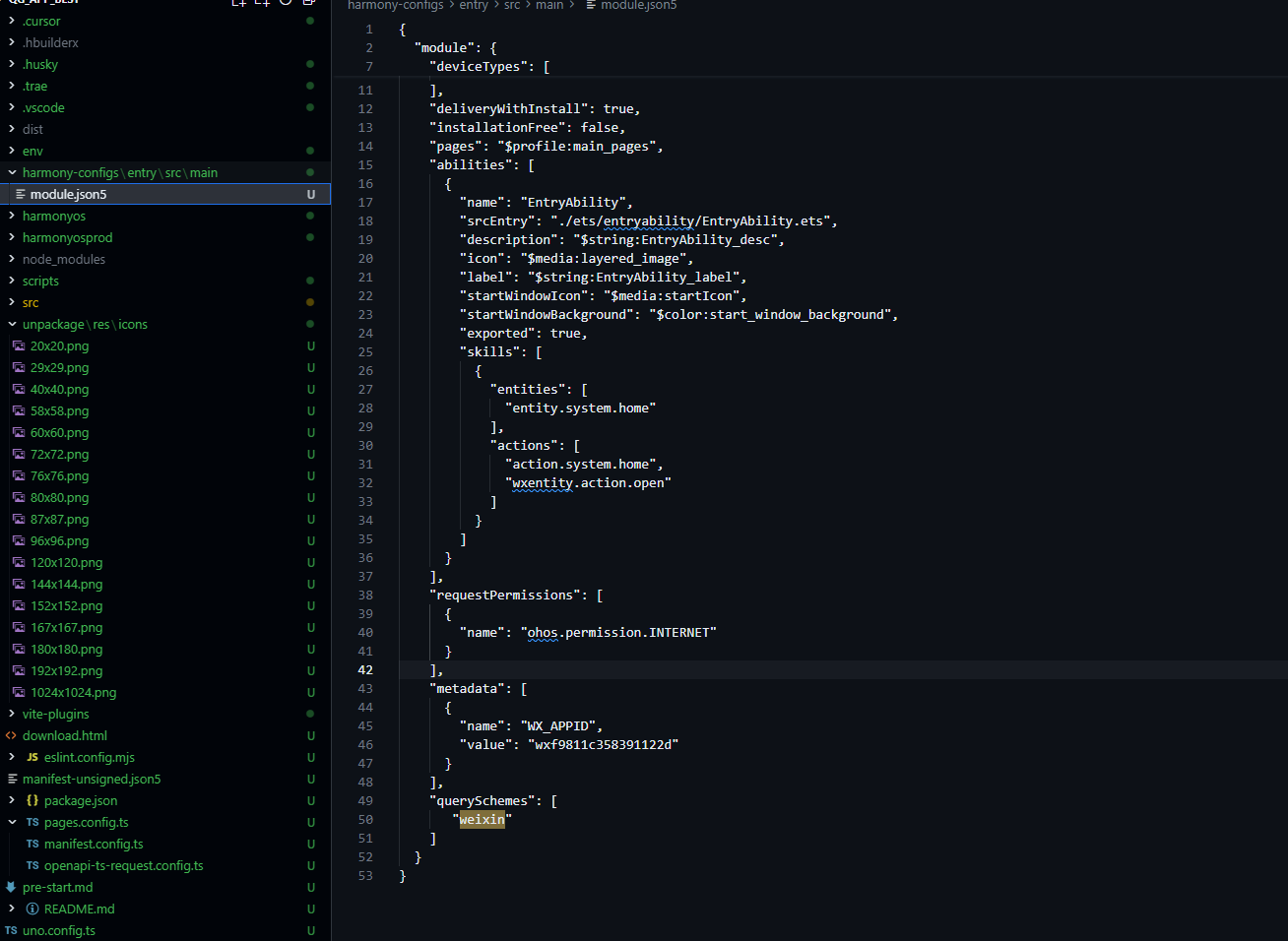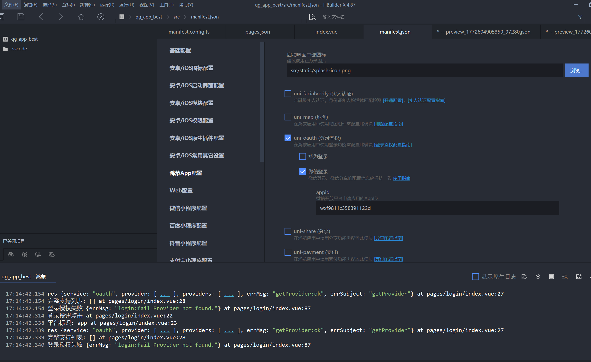 manifest.json中的app-harmony节点,并确认微信后台配置无误。若仍有问题,建议等待后续鸿蒙平台微信 SDK 的更新支持。DCloud_UNI_yuhe