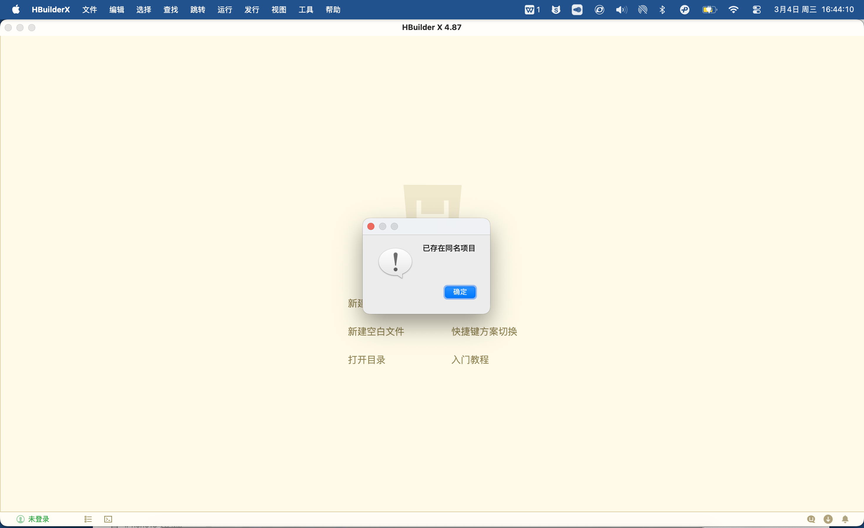 当你用默认模板创建一个 UTS 项目后,项目根目录下会生成一个 uni-app x 工程结构。如果关闭 HBuilderX 后再次通过「文件 → 打开项目」选择同一个目录,HBuilderX 会检测到该目录已存在同名项目,于是弹出「已存在同名项目」的提示,防止你误操作把已有工程覆盖掉。