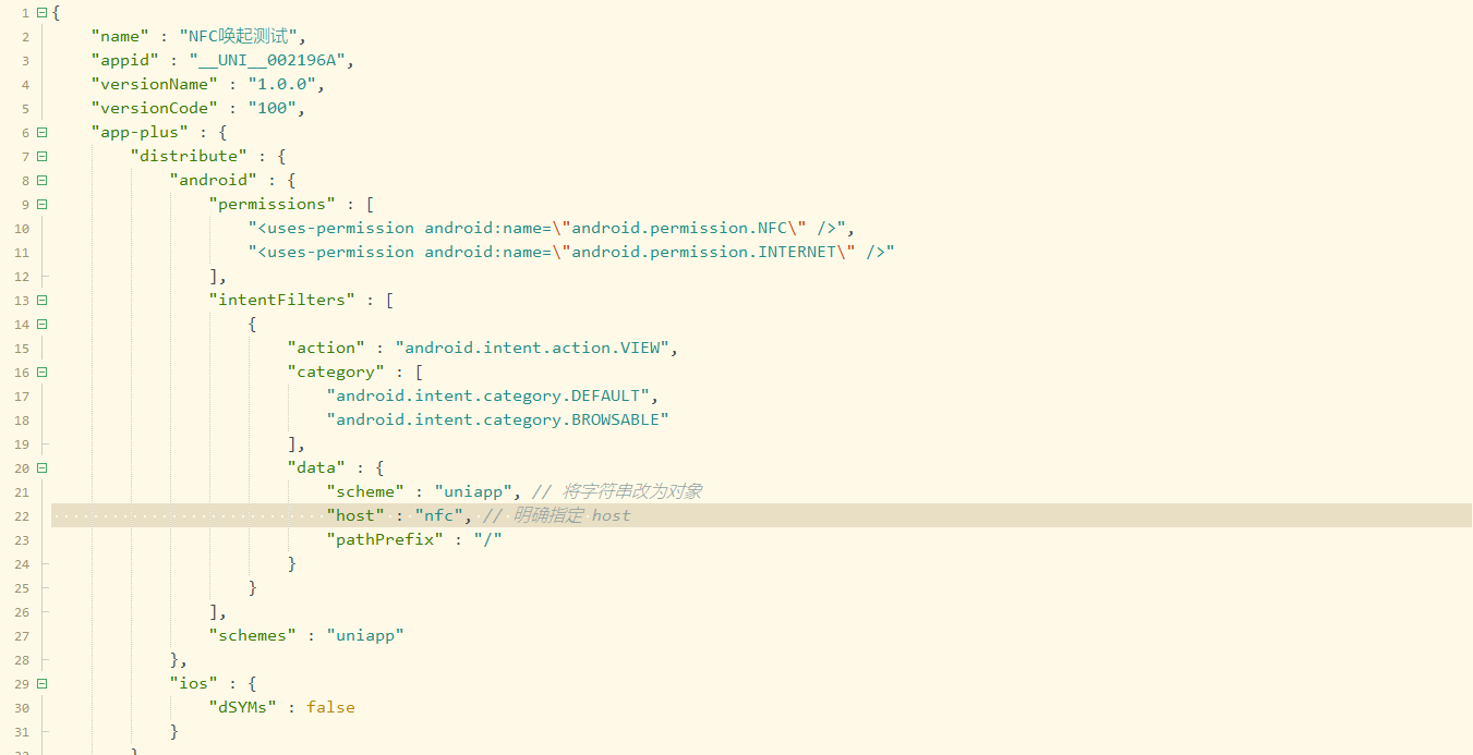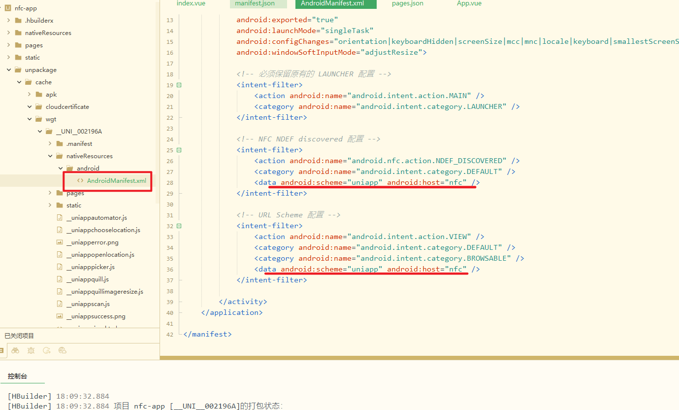 AndroidManifest.xml,只在 manifest.json 里配置"app-plus": { "distribute": { "android": { "schemes": "uniapp.nfc,uniapp" } } } - 如果一定要用自定义