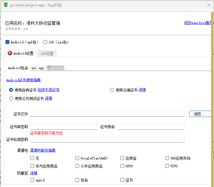 id(即 uni-app 的 appid) - manifest.json → “app-plus” → “distribute” → “android” →