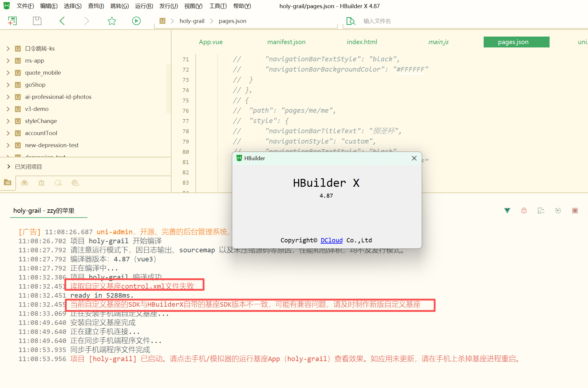 - 确保基座是通过当前使用的 HBuilderX 4.87 版本制作的,而不是旧版本残留的基座