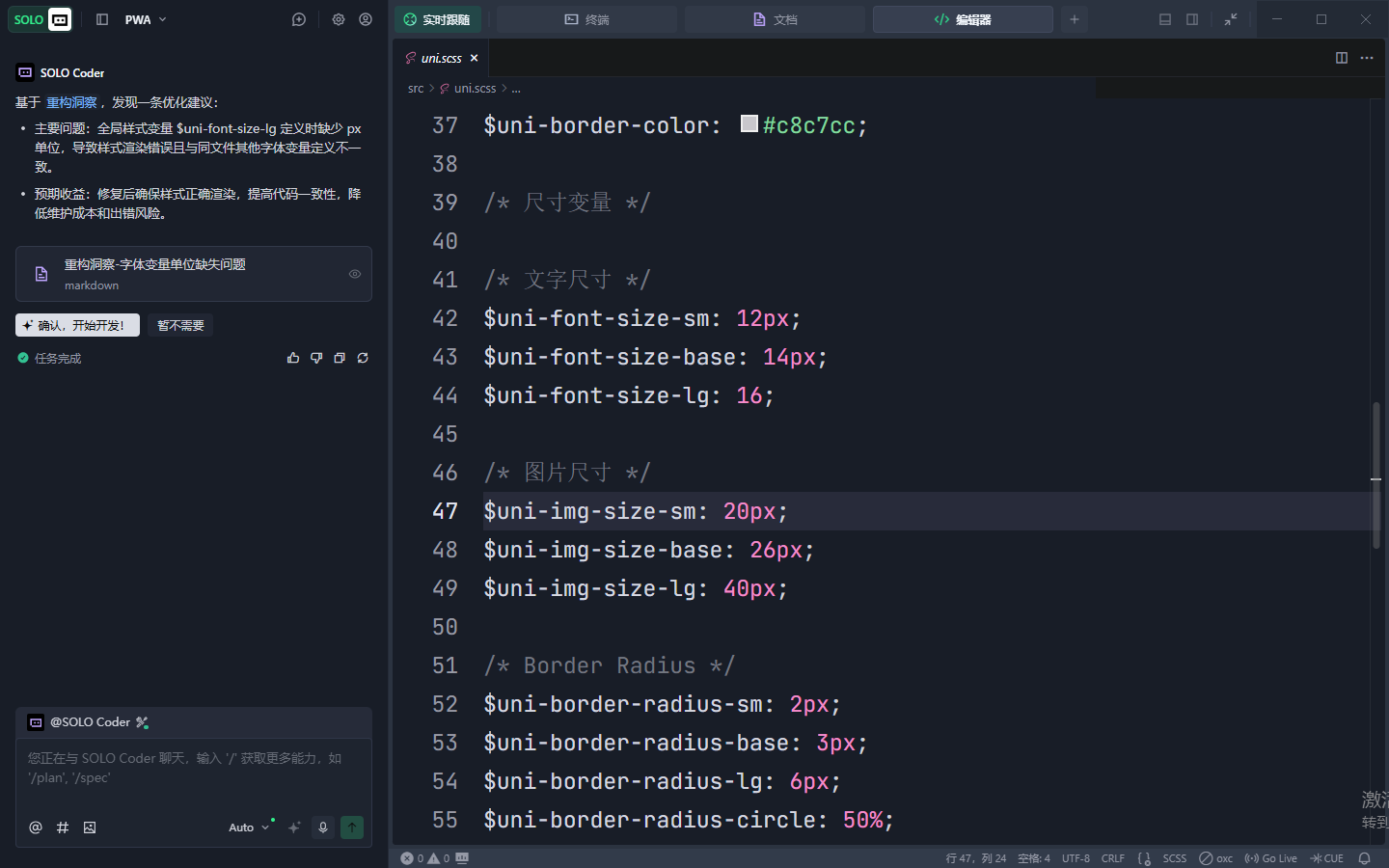 如果在 CLI 创建的项目中发现 uni.scss 文件缺少 $uni-font-size-lg 或其他预置变量,可以手动在项目的 uni.scss 文件中补充上述变量定义。uni.scss 是一个特殊文件,在代码中无需 import 即可在 scss 代码中使用这些样式变量。